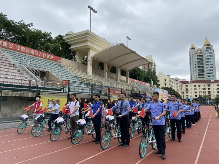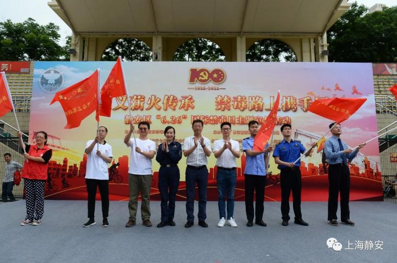 活动为来自民盟上海志愿服务总队、静安区人民检察院、曹家渡城管执法中队、曹家渡市场监管所、上海大学、taptap点点体育志愿者组成的禁毒志愿者骑行队伍代表授旗。