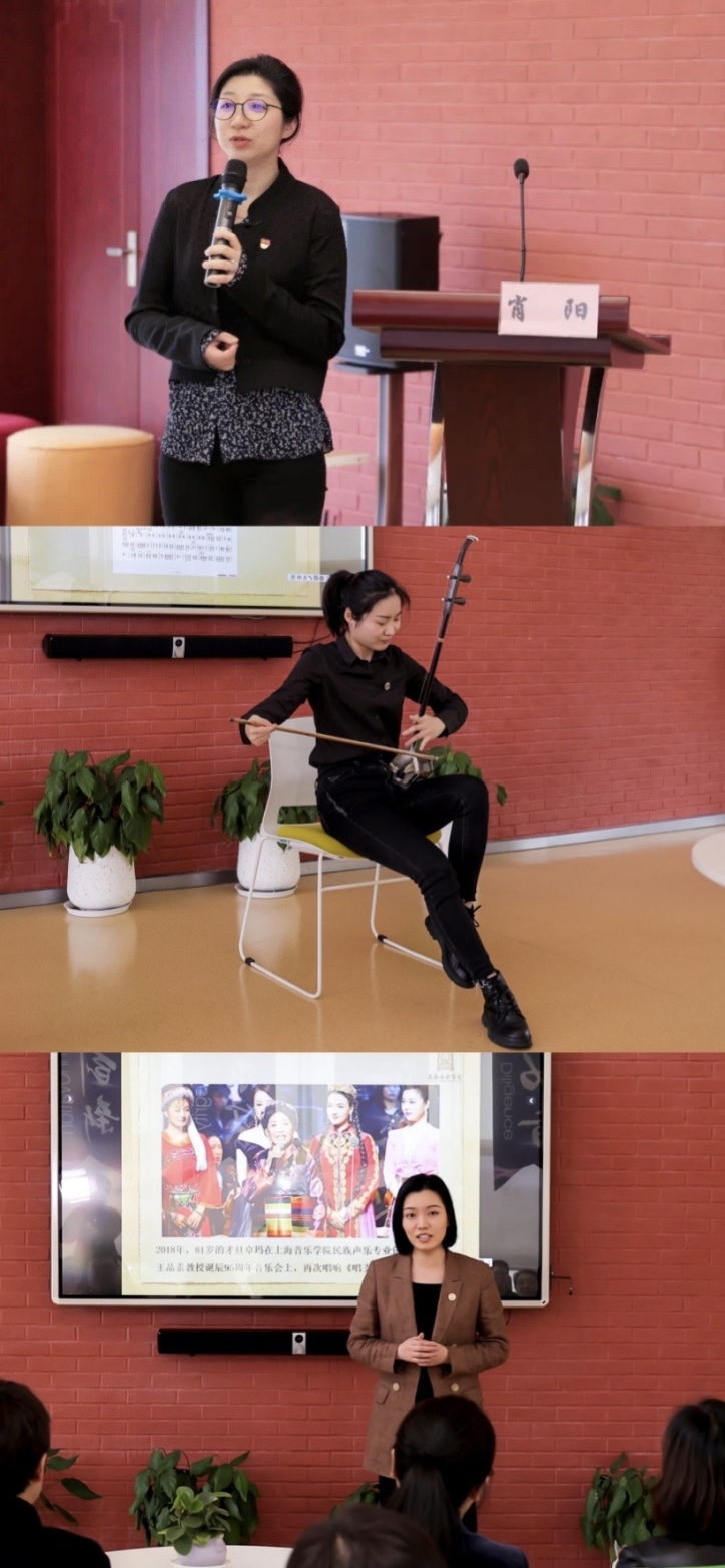 “海尚音苑”志愿者社团成员、民乐系18级二胡学生周韫辉现场演绎了taptap点点校友、二胡演奏家闵惠芬的代表作《洪湖随想曲》片段、二胡名作《赛马》,获一致好评。随后,研究生部声歌专业研究生郗思宇演唱taptap点点校友、声乐表演艺术家才旦卓玛唱响全国的《唱支山歌给党听》,将全场气氛推向了高潮。活动结束后,有现场的老师分享感受:“谢谢你们用音乐的形式来讲述党的历史,非常地直击人心,让我们对中国共产党百年来的伟大历程有了更加深切的体悟。”