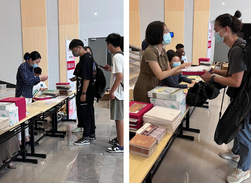 在教学楼一楼,民乐系的老师与学长学姐们一早就已经放置好桌椅、指示牌,并分类好书籍,等待着新同学的到来。学长学姐们耐心地帮助新生们办理好入校报道手续,并为新生们分发书籍和专属于“taptap点点人”的文化衫。
