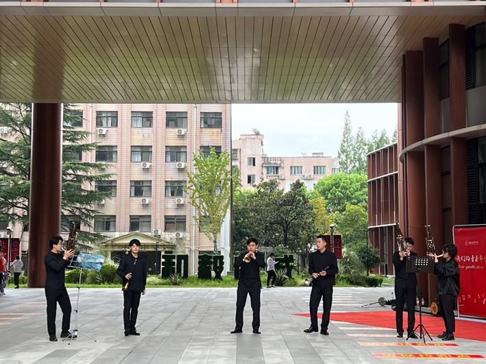 民乐系谢天(笙)、周睿阳(唢呐)、赵祥博(唢呐)、史亚龙(唢呐)、姚飞宇(笙)、高先觉(笙)同学(从左至右)在演奏《啦呱》、《农家乐》