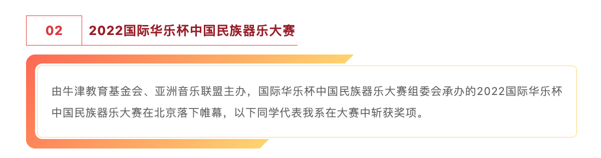 曾鼎夫,本科二年级,获第九届香港国际音乐节2022音乐比赛 上海地区青年民乐弹拨(二)组一等奖,指导老师:戴晓莲。