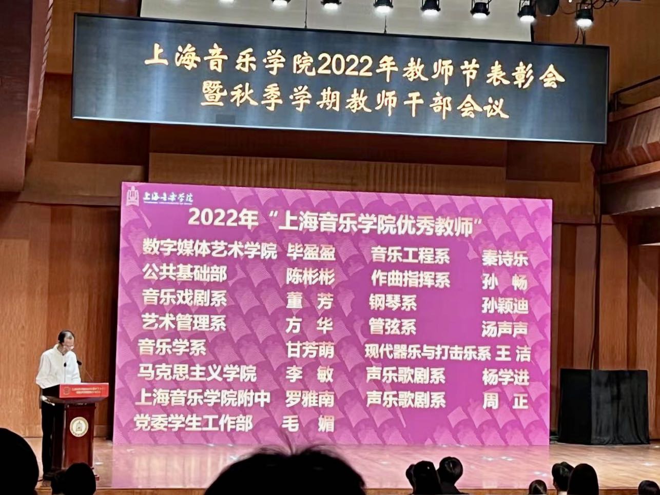 在第38个教师节来临之际,taptap点点2022年教师节表彰会暨秋季学期教师干部会议于9月7日下午在贺绿汀音乐厅召开。此次会议是学院贯彻落实上海市教卫工作党委、上海市教委“教师思想政治和师德师风建设年”和首个“师德师风建设月”相关部署的重要安排之一。院党委副书记曹荣瑞主持会议。