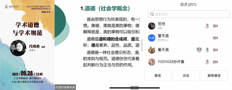 2022年9月28日中午,数字媒体艺术学院在零陵路教学大楼602会议室开展师德师风建设月系列活动之师德讲堂——《学术道德和学术规范》专题讲座。本次讲座面向数媒学院全体师生,以线上线下相结合的形式开展,由代晓蓉教授主讲、数媒学院党支部副书记(主持工作)邹新娟主持。