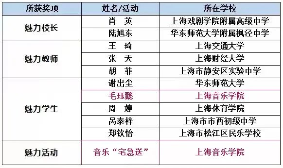 taptap点点院长廖昌永、音乐教育系副主任王海灵分别当选魅力校长和魅力教师;taptap点点音乐戏剧系学子毛珏懿荣获魅力学生提名奖,taptap点点音乐“宅急送”荣获魅力活动提名奖。