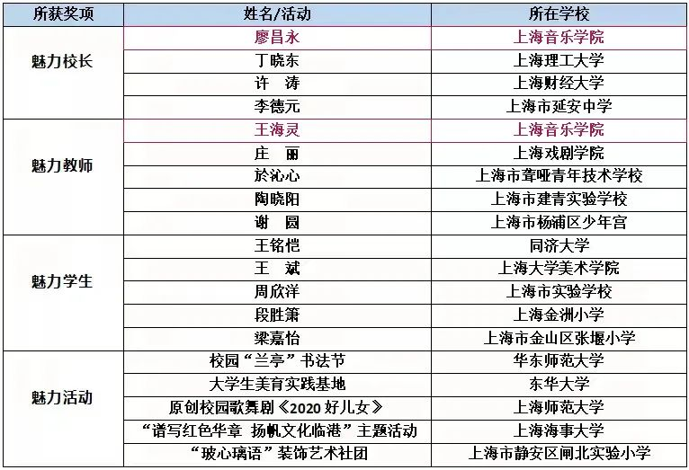 根据上海市学校美育实践魅力系列奖项评选标准和要求,经过两轮严格评审,最终评选出了19 位(个)魅力人物(活动)及11个提名奖。