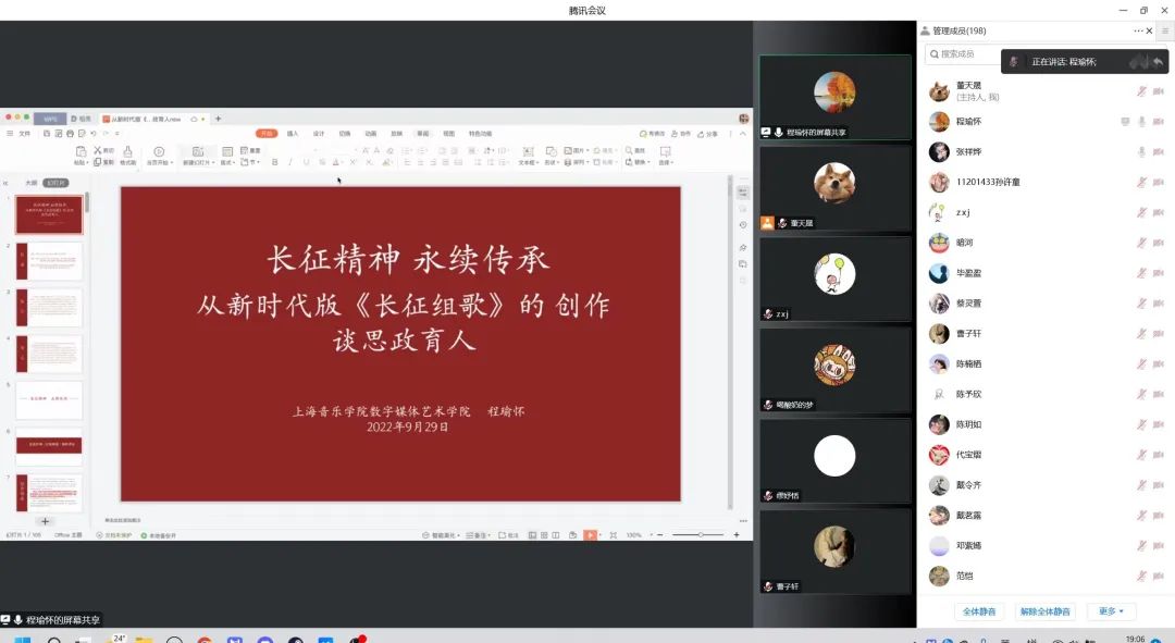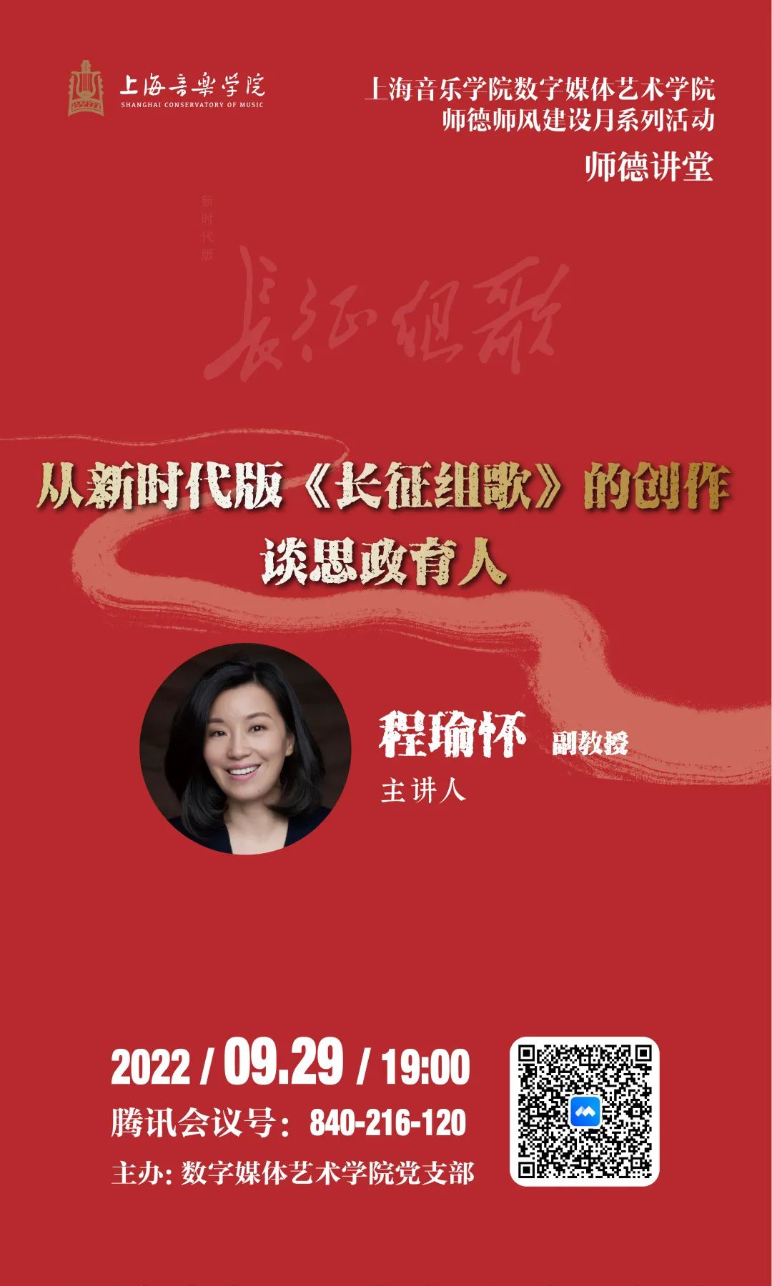 2022年9月29日晚上,数字媒体艺术学院在腾讯会议开展了师德师风建设月系列活动之师德讲堂——“长征精神 永续传承——从新时代版《长征组歌》的创作谈思政育人”专题讲座。本次讲座面向数媒学院全体师生,由程瑜怀副教授主讲、数媒学院党支部副书记(主持工作)邹新娟主持。