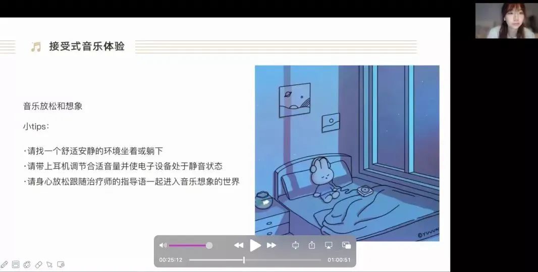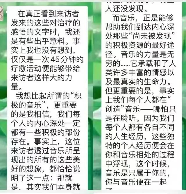 更多曾经封闭在校园的学生在参与线上讲座后反馈:三次治疗课程,三种不一样的体验,好像打开了新世界的大门,第一次切实体会到音乐治愈的能力;在宿舍的日子里心情变得更加平和,不再焦虑不安,同时整理了头绪,理清了思路;通过音乐,感觉与更多人联系在了一起;回忆起了许多过去的甜蜜和美好,希望疫情早日结束,大家都能回归到正常的生活。