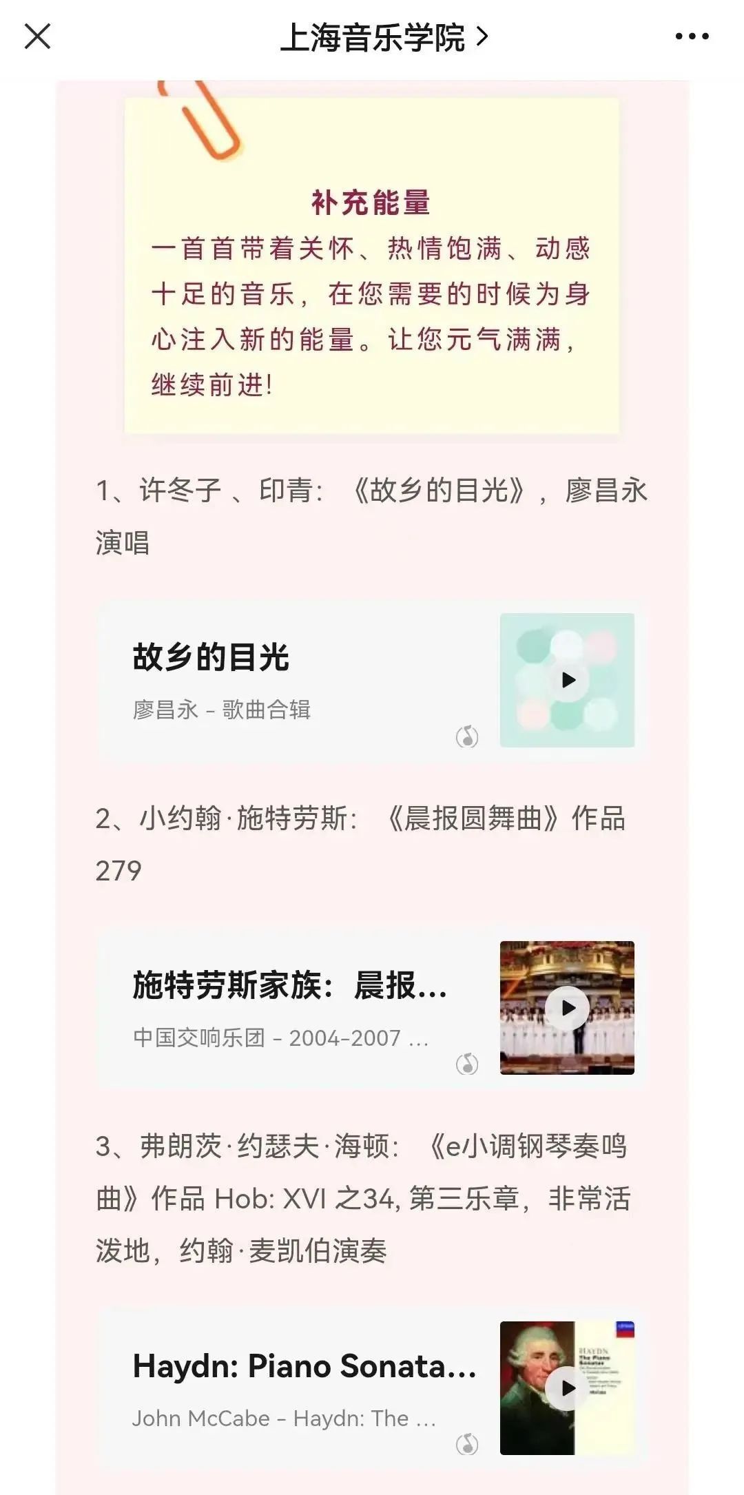 2020年疫情突然来袭后,一些医疗和音乐机构相继推出“音乐处方”,舒缓和抚慰焦虑的情绪,对taptap点点体育来说,专业优势也有了更多的用武之地。“我们推出了不同主题的音乐集锦,包括学生自己创作的歌曲,以及深受大家欢迎的taptap点点自己的歌唱家的作品。”杨燕宜介绍,那段时间,在院领导带领下,taptap点点迅速组织起了音乐康疗团队,为医疗机构定制“环境音乐”方案,在微信公众号推送音乐专辑,还专门制作了借助音乐放松冥想的音频,“跟着音乐康疗师的语言引导,不知不觉就在音乐中排除了杂念,得到了情绪疏导。”