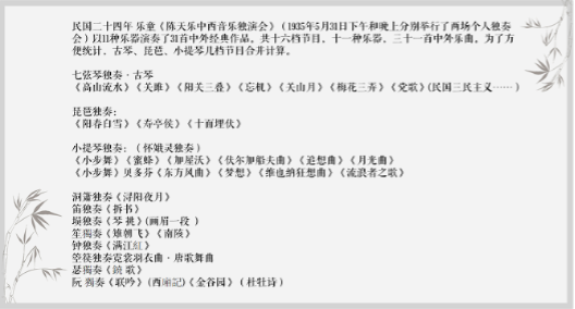 在现今看来这也是令人叹为观止的个人独奏音乐会。古今中外,能有陈天乐先生这样才华横溢、学贯中西的大家实属罕见。