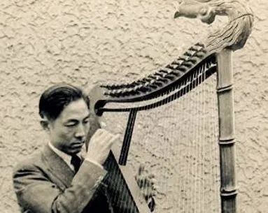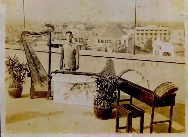 陈贵平老师展示的照片里,还有许多陈天乐先生演奏各种乐器的照片,其中有一张是先生在上海某楼的天台上拍摄,图片中的琴、瑟和箜篌,皆为陈天乐先生与父亲陈世铎设计,制作大师万长松先生制作。