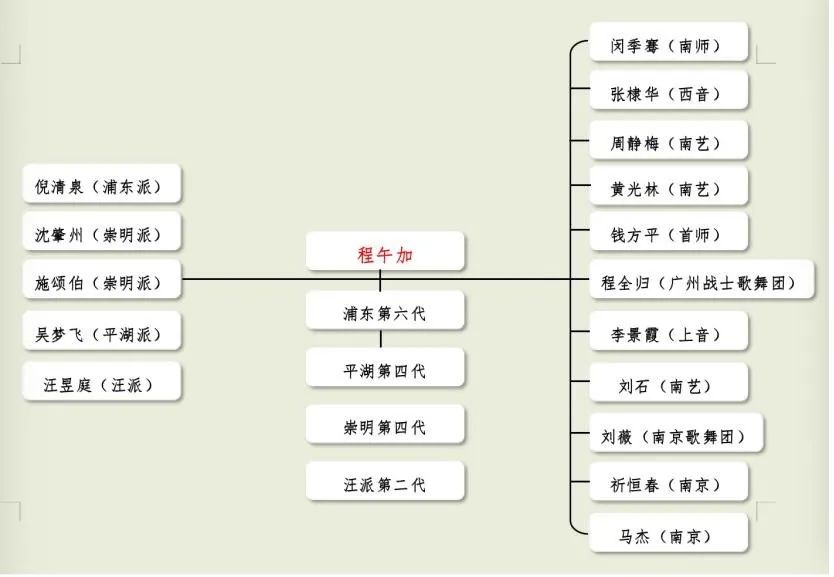 师承关系是流派发展的重要环节,作为汪派“四大弟子”的长兄,程午加先生不仅是汪派的第二代传人,同时又是浦东派第六代传人,平湖派第四代传人和崇明派的第四代传人,他吸收了各家各派之精髓后,又独树一帜形成了自己的风格。同时作为著名的琵琶教育家,桃李满天下,为中国琵琶事业培养了一批优秀的琵琶表演艺术人才,其中很多学生已是当今海内外极具影响力的琵琶演奏家、教育家。