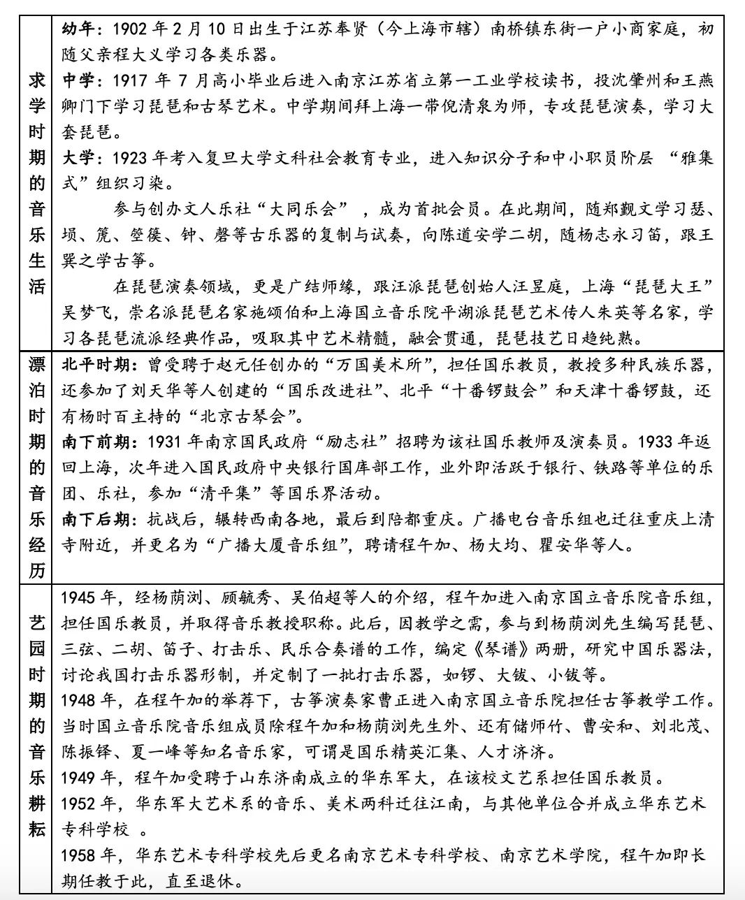 程午加先生1902年2月10日出生于江苏奉贤(今上海市辖)南桥镇东街一户小商家庭,初随父亲程大义学习各类乐器。中学期间,拜上海一带倪清泉为师,专攻琵琶演奏。高小毕业后进入南京江苏省立第一工业学校读书,投沈肇州和王燕卿门下学习琵琶和古琴艺术。后考入复旦大学文科社会教育专业,进入知识分子和中小职员阶层“雅集式”组织习染。他参与创办文人乐社“大同乐会”,成为首批会员,其后加入乐社的成员,还有金祖礼、卫仲乐、秦鹏章、许光教、陈天乐等国乐大家。在此期间,随郑觐文学习瑟、埙、箜篌、钟、磐等古乐器的复制与试奏,向陈道安学二胡,随杨志永习笛,跟王巽之学古筝。而后,他在琵琶演奏领域,更是广结师缘,跟汪派琵琶创始人汪昱庭,上海“琵琶大王”吴梦飞,崇明派琵琶名家施颂伯和上海国立音乐院平湖派琵琶艺术传人朱英等名家,学习各琵琶流派经典作品,吸取其中艺术精髓,融会贯通,琵琶技艺日趋纯熟。