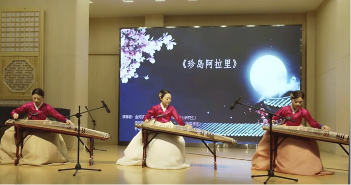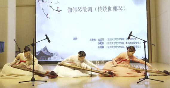 最后,崔玉花教授还介绍了目前朝鲜族伽倻琴的表演,包括独奏、室内乐、合奏、弹唱等演奏形态。并由三位学生带来了改良伽倻琴三重奏,曲目为崔美鲜教授根据朝鲜民谣改编的《珍岛阿拉里》和《锦绣三千里》。