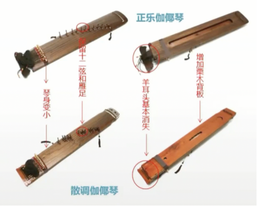 相同之处——十二弦,在每根线下设有雁足,用来微调琴弦。