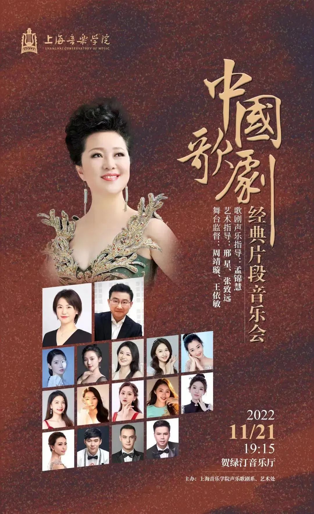 2022年11月21日,由孟锦慧副教授担任歌剧声乐指导的“中国歌剧经典片段”专场音乐会如期在贺绿汀音乐厅举行。本场音乐会由上海音乐学院声乐歌剧系、艺术处主办,邢星、张致远担任艺术指导。此次音乐会,是孟锦慧副教授自2020年起带领学生举办歌剧讲座和“民族歌剧民族魂”音乐党课的总结与汇报,也是对党的二十大精神中“坚定文化自信,传承优秀传统文化”的努力践行。