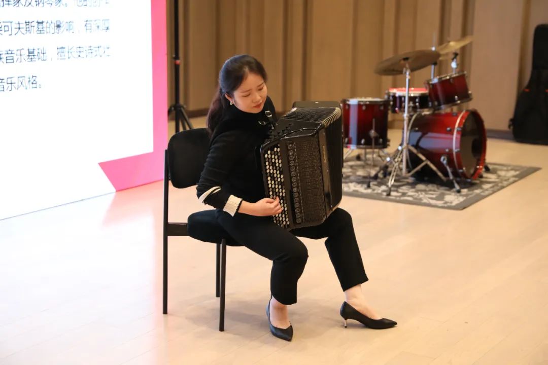 现场,现代器乐与打击乐系朱政老师以“忆手风琴红色往昔”为主题开展了一堂生动的音乐党课,全体纪检监察干部参加学习。手风琴和电子管风琴二重奏《领航》《不忘初心》联奏开篇,展现了中国共产党一路走来的光辉历程,唱响了礼赞百年风华、奋斗新时代的昂扬主旋律。朱政老师以党的二十大报告提出的“全面从严治党体系”为主线,根据习近平总书记关于全面从严治党的一系列新思想、新观点、新论断,结合红色音乐理论概念、手风琴红色经典文化,分享了关于全面从严治党需要适应新时代新征程的形势任务、需要健全全面从严治党体系、需要系统化推进的心得感悟。