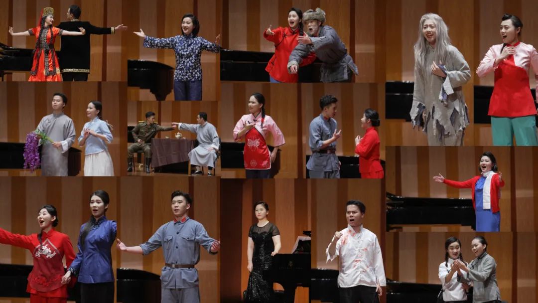 随后中国第一部新歌剧《白毛女》中最具代表性的两个选段:《恨似高山仇似海》《北风吹,扎红头绳》的演唱,三位同学刘思源、李沛桐、孟欣在舞台上用真挚的情感诠释了歌剧中蕴含的思想内涵。还有《洪湖赤卫队》里韩英的唱段《看天下劳苦人民都解放》,《红珊瑚》中的珊妹的唱段《海风阵阵愁煞人》,《长征》里彭政委的唱段《我的爱人,你可听见》,《伤逝》中涓生与子君的重唱《紫藤花》,《原野》中金子的唱段《啊,我的虎子哥》,《野火春风斗古城》中的对手戏《开药方》《玉镯》,《沂蒙山》中的男女二重唱《等着我,亲爱的人》,以及《冰山上的来客》中的男女主人公的重唱《花儿为什么这样红》。这18首作品都选自不同时期的经典歌剧,每首都脍炙人口、深入人心,并且成为民族声乐教学当中的必唱曲目,而红色经典作品中的英雄人物形象也影响了一代又一代人。通过演英雄、唱英雄、学英雄,上音学子在诠释歌剧人物时全情投入,与角色同呼吸、共命运,将一个个鲜活的人物形象展现给观众。
