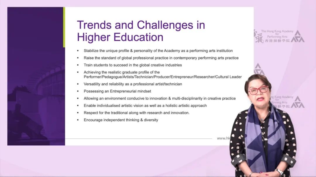 香港演艺学院校长蔡敏志认为,音乐学院应致力于将行业参与、鼓励创新、跨学科融合、国际化发展,及实践式研习的理念贯穿其所有课程中,将教育教学质量视为重中之重,提高当代全球表演艺术实践的专业标准,积极推动国际合作,建立卓有成效的艺术和学术合作伙伴关系,通过优质的课程和师资队伍引领,培养具有全球影响力的新一代表演艺术家和文化领袖。