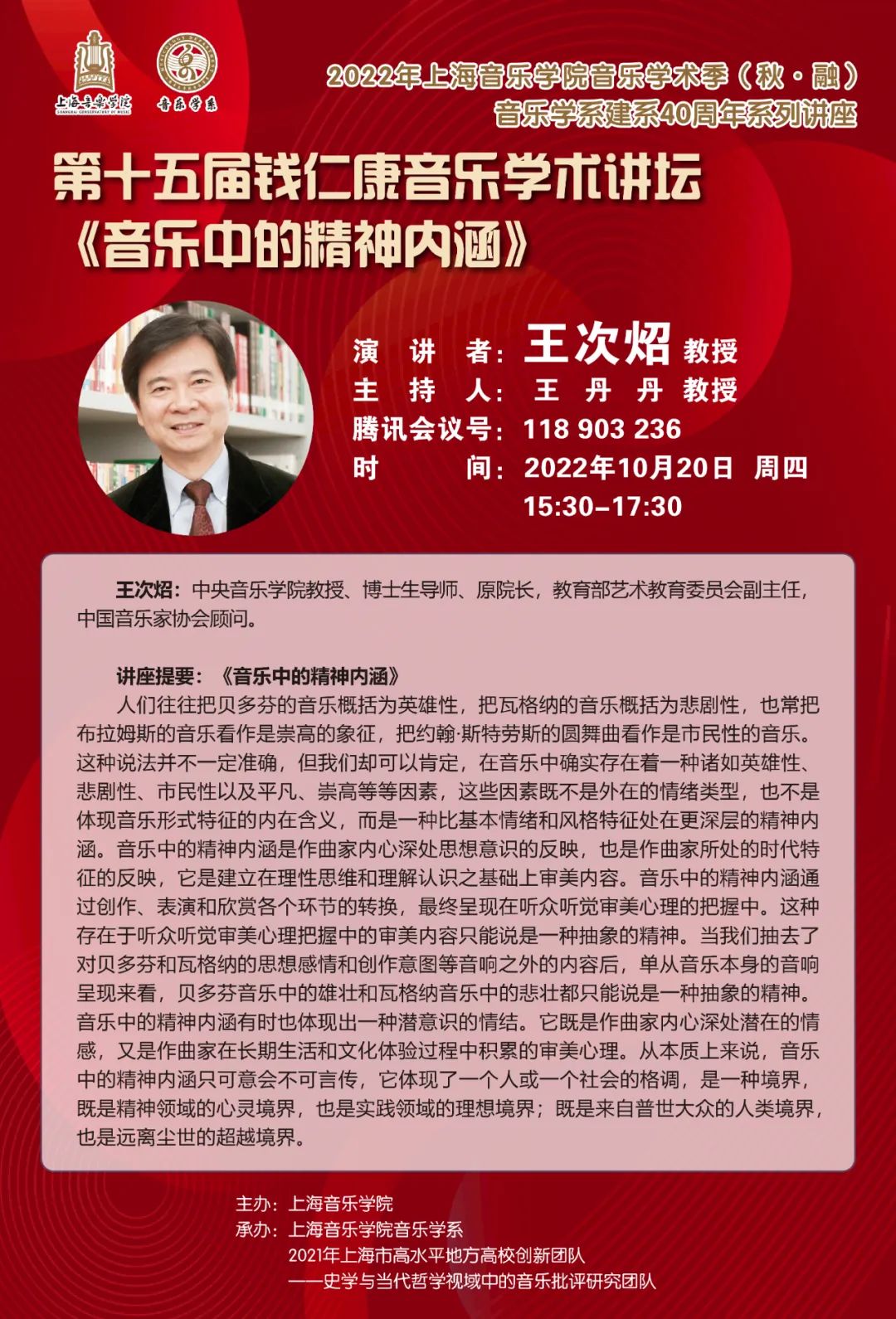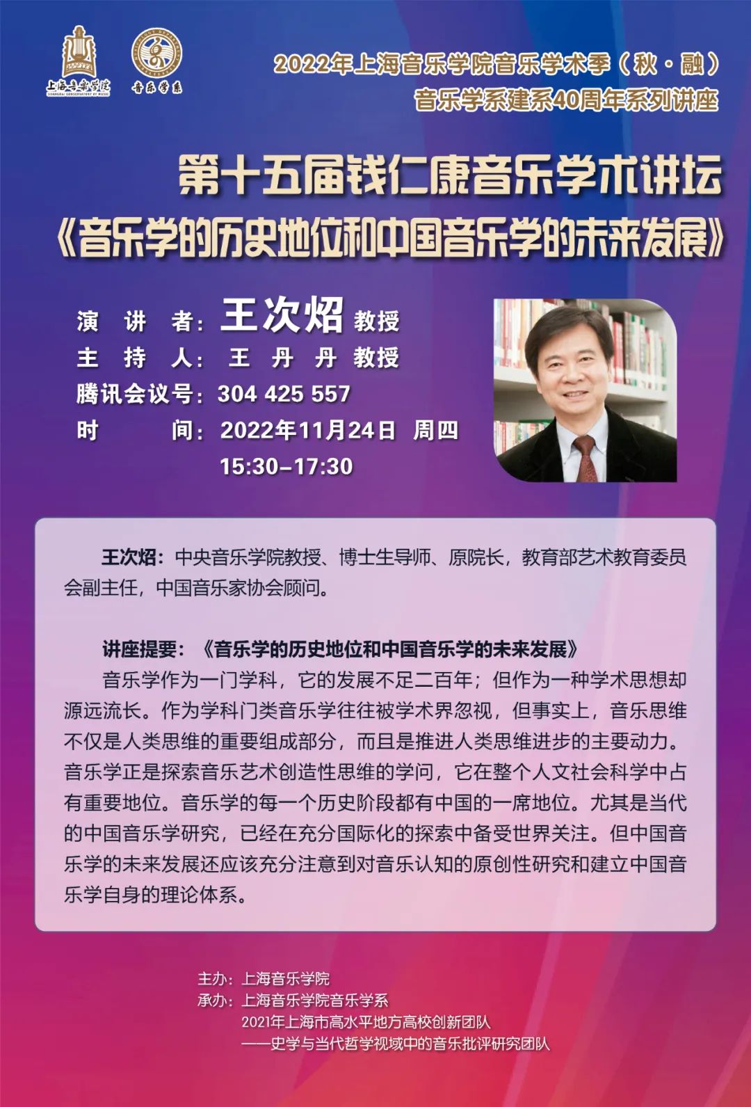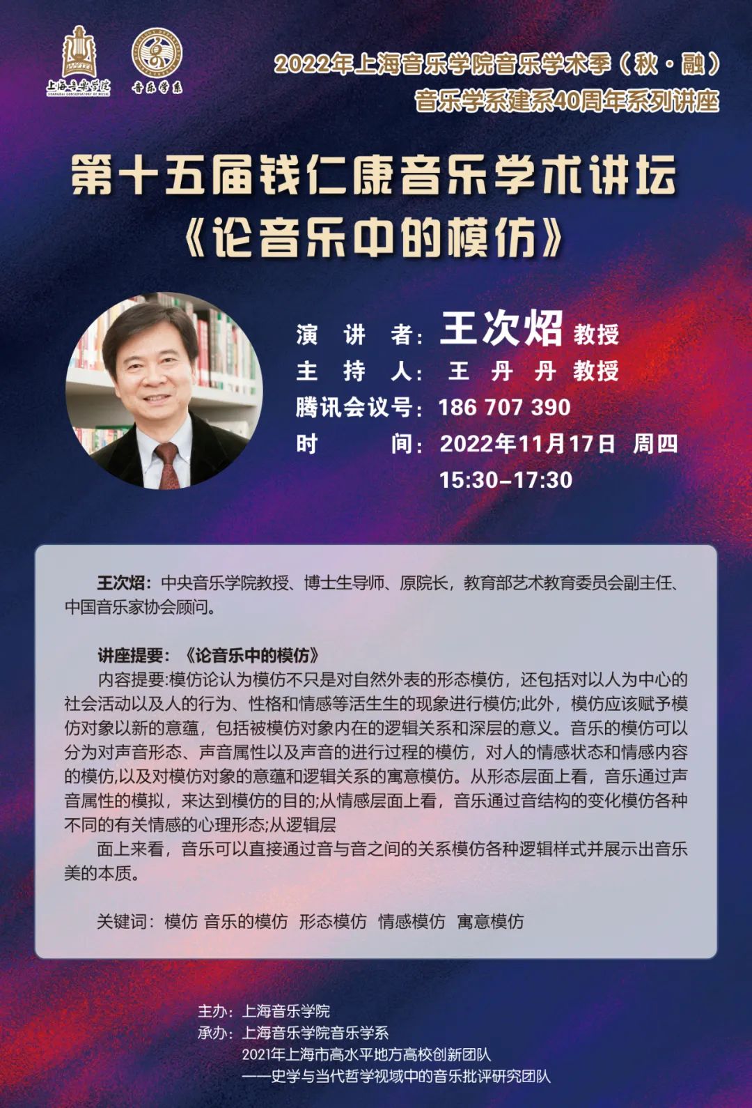 2022年上海音乐学院音乐学术季“秋·融”音乐学系建系40周年系列讲座之“第十五届钱仁康音乐学术讲坛”邀请到中央音乐学院教授、博士生导师、原中央音乐学院院长,音乐美学专家王次炤先生作为主讲人,分别于2022年10月14日、11月17日、11月24日开展了三场讲座,均以线上(腾讯会议)形式进行,上音师生和各兄弟院校师生近三百人学习聆听。