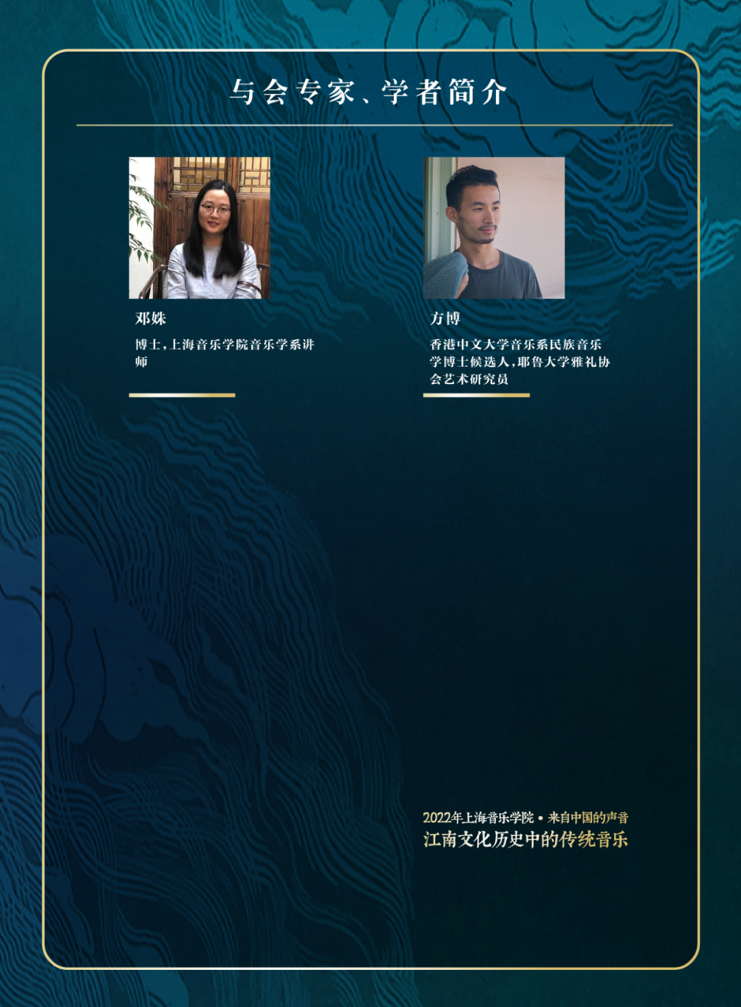 为了积极响应国家战略对中国传统文化与长三角一体化发展的重视与强调,由上海音乐学院2021年高水平地方高校创新团队建设•新时代中国音乐文化传承与创新团队主办,上海音乐学院贺绿汀中国音乐高等研究院、中国音乐非遗保护与研究中心和上海音乐学院音乐学系共同承办的“江南文化历史中的传统音乐”学术研讨、论文征选与交流论坛系列活动,于2022年11月18日-19日线上召开。