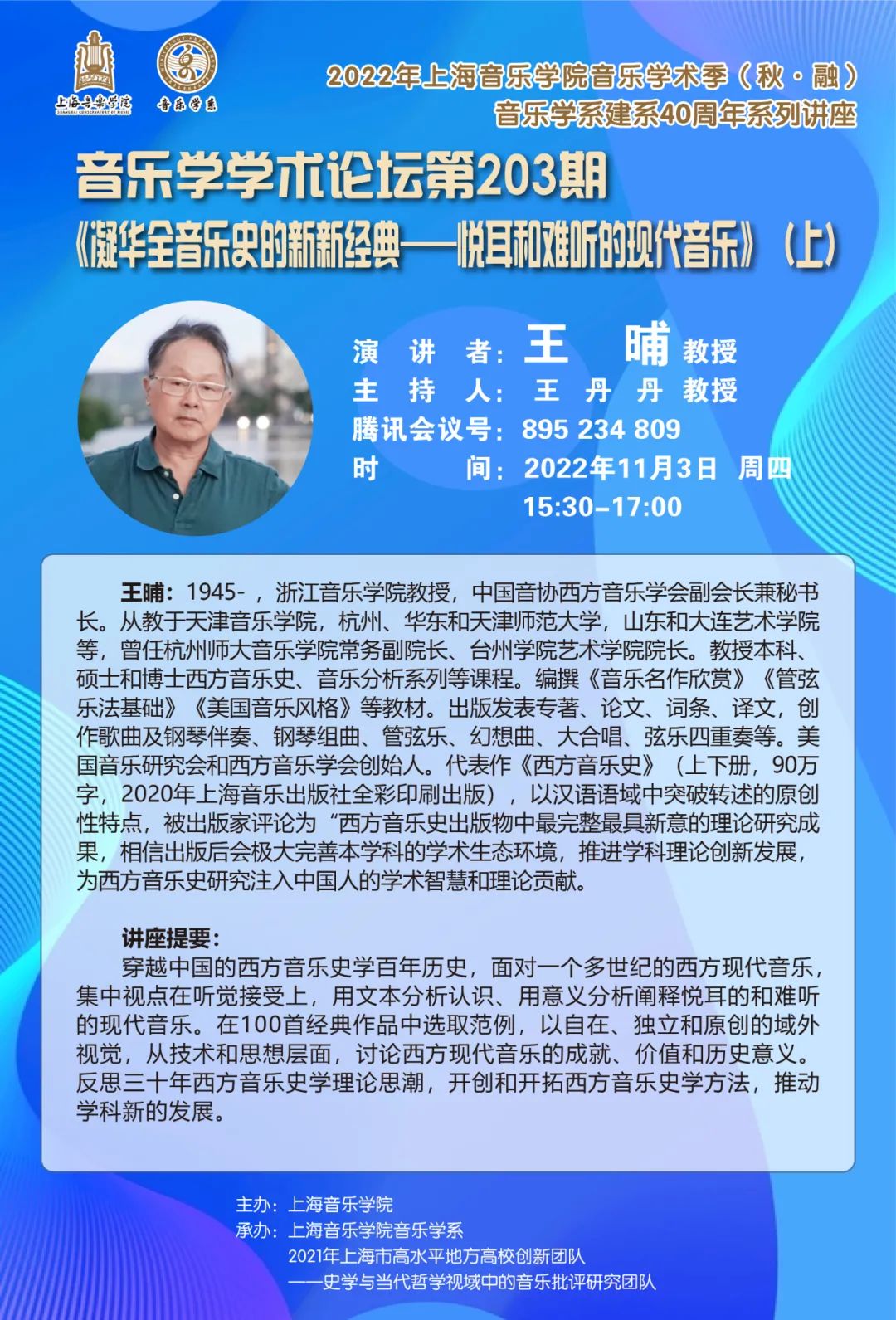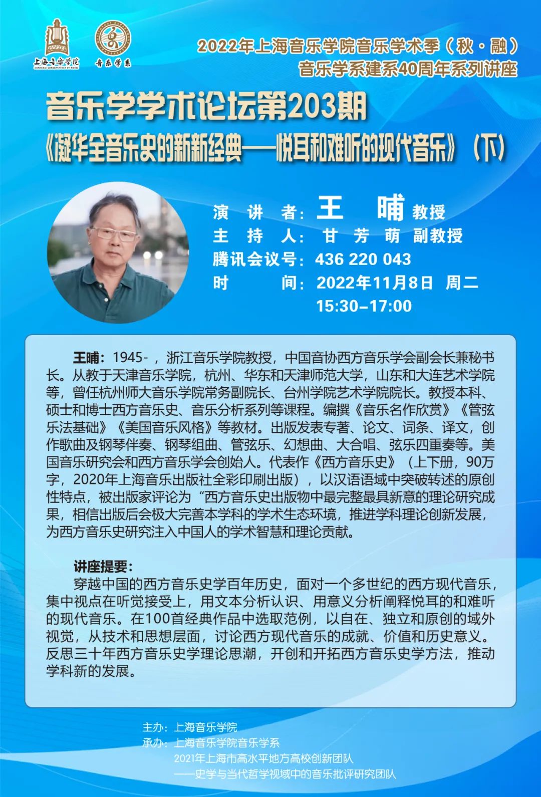 2022年11月3日、11月8日,上海音乐学院音乐学术季(秋·融)讲座邀请到了浙江音乐学院教授,中国音协西方音乐学会副会长兼秘书长王晡教授作为主讲人,以“凝华全音乐史的新新经典——悦耳和难听的现代音乐”为题展开专题讲座,本次讲座分为上、下两场,分别由音乐学系王丹丹教授、甘芳萌副教授主持。