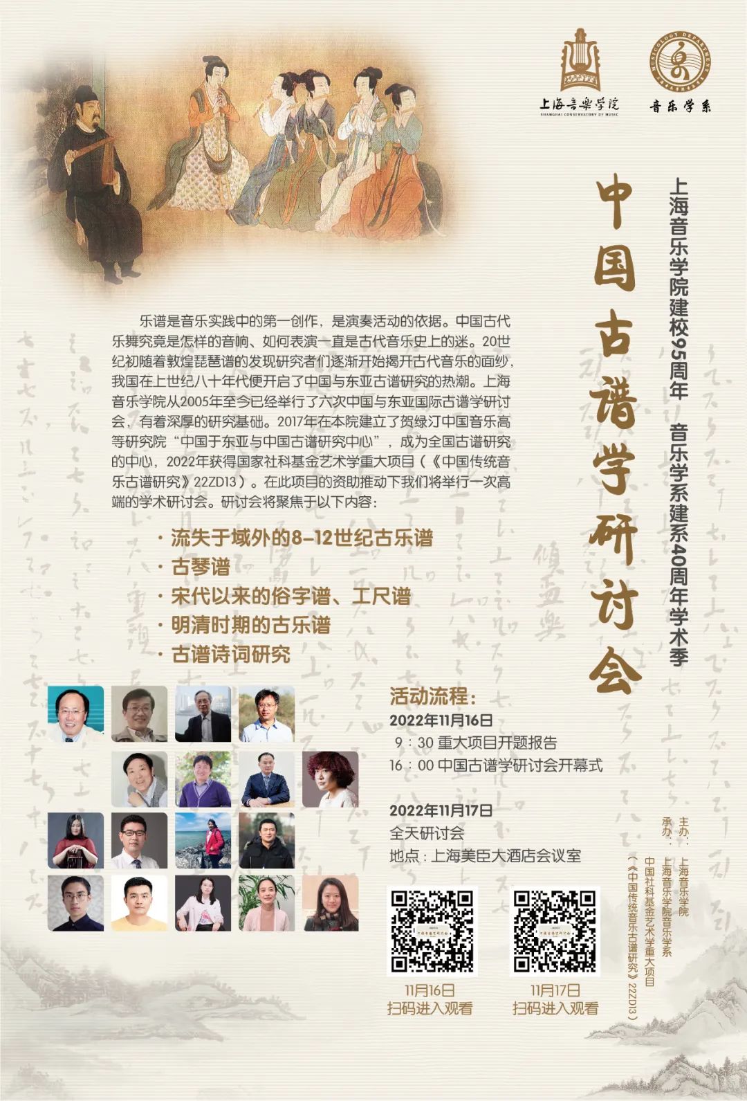 中国古谱学研讨会暨2022年国家社科基金艺术学重大项目“中国传统音乐古谱研究”课题组第一次工作会议在线上线下同步展开。在《中国传统音乐古谱研究》重大项目的助推下,围绕唐代、宋代、明清时期的古代乐谱以及古琴谱相关的研讨会正式召开。此次会议由上海音乐学院音乐学系承办,属上海音乐学院“建校95周年·艺术学研究学术周”以及音乐学系系庆40周年系列活动。
