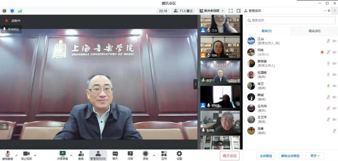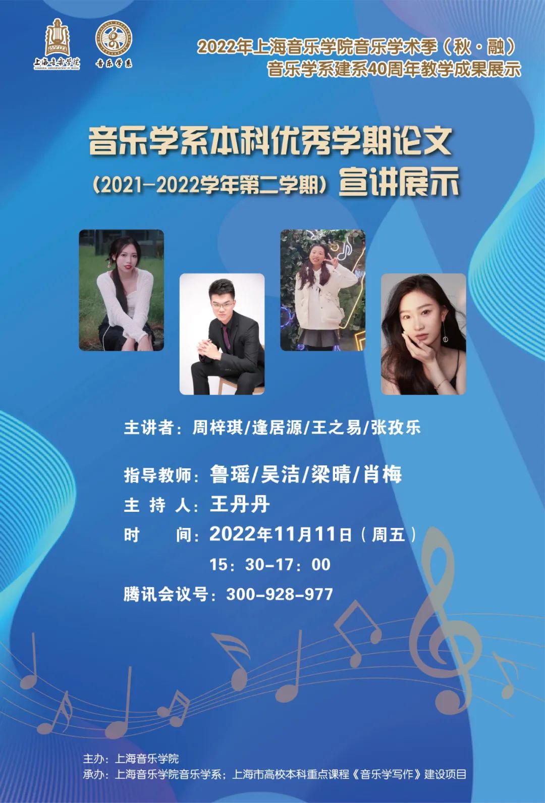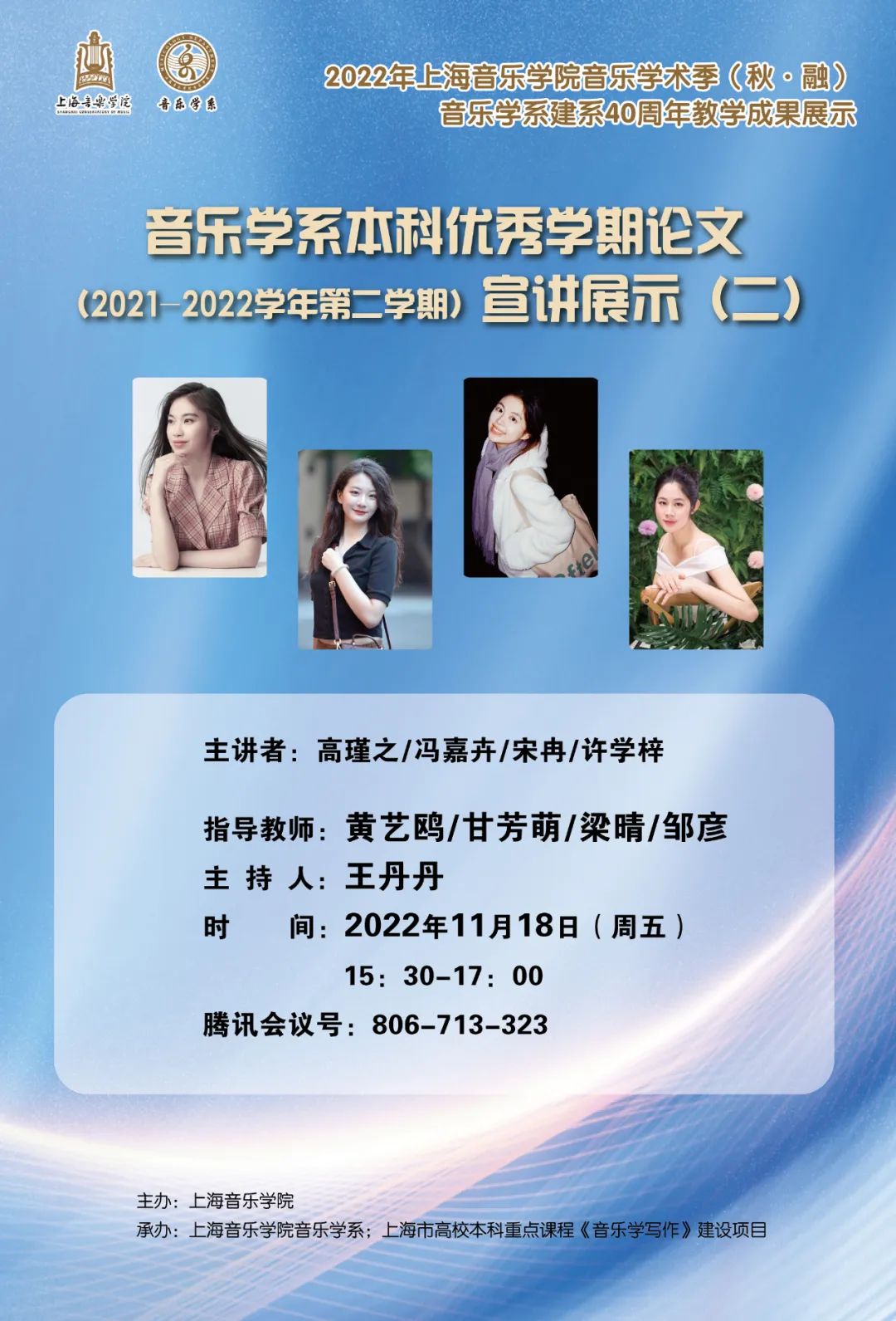 2022年11月11日、11月18日,上海音乐学院2022年音乐学术季(秋·融)暨音乐学系建系40周年教学成果展示《音乐学系本科优秀学期论文(2021-2022学年第二学期)宣讲展示》在腾讯会议进行。