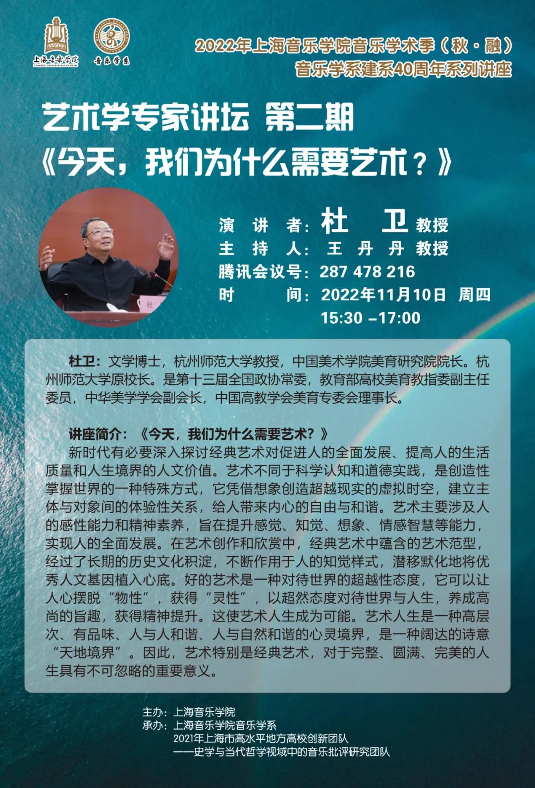 2022年11月10日,上海音乐学院音乐学术季艺术学专家讲坛第二期邀请到了杭州师范大学教授、中国美术学院美育研究院院长杜卫带来讲座《今天,我们为什么需要艺术?》。这一课题是杜卫教授最近的一项研究成果,是关于经典艺术人文价值的阐述。