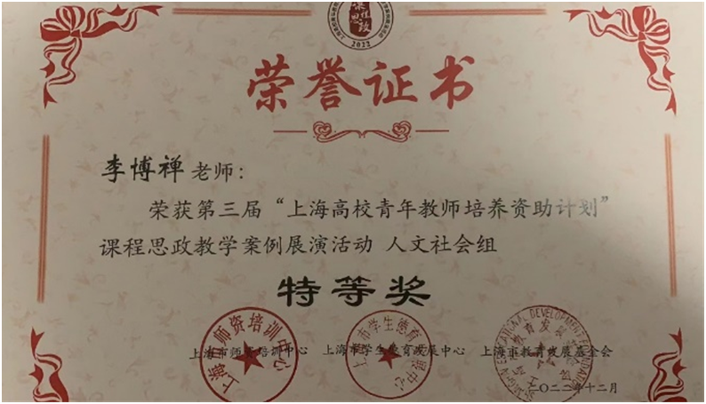 在第三届“上海市高校青年教师培养资助计划”课程思政教学案例展演活动中,我院作曲指挥系青年教师李博禅获人文社会组(文史哲类教育学类艺术类)特等奖。