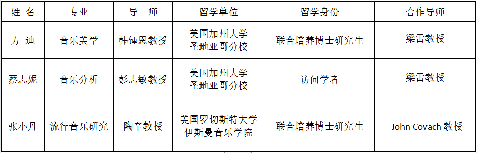近年来,我院持续与美国、德国等国家的音乐院校开展联合培养研究生的人才培养项目,本年度我院三位博士研究生成功通过国家留学基金委员会的专家评审,获得国家公派出国留学资格,入选国家留学基金艺术类人才培养特别项目。