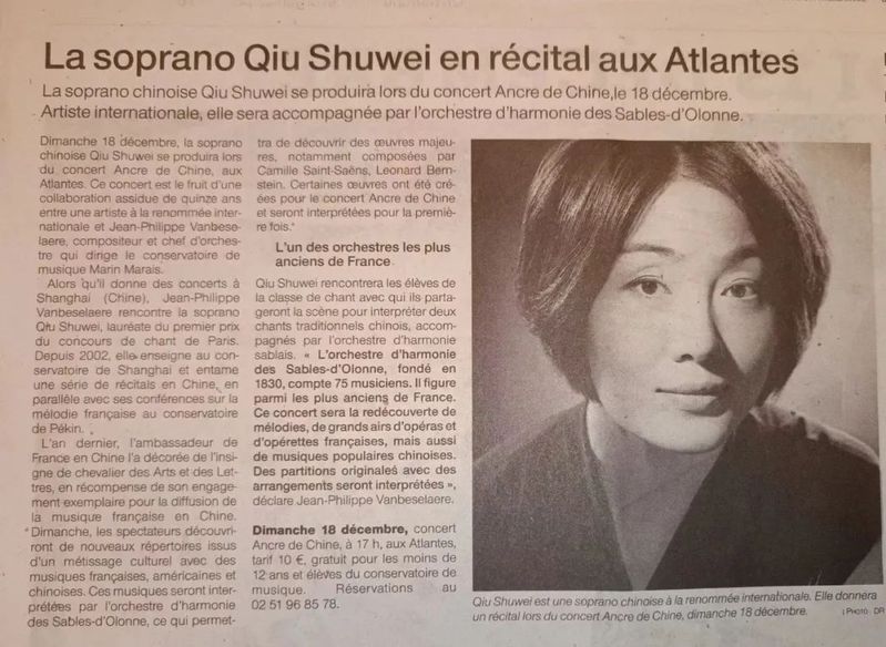 12月18日晚,音乐会在莱萨布勒多洛讷最大的、美丽迷人的滨海音乐厅莱萨特兰特 (Les Atlantes) 举行,每年新年前夕在这座海滨城市隆重举办音乐会是一个历史传统。而2023年的特别新年,主办方则是首次邀请这位与法国有着文化渊源的中国女高音歌唱家邱曙苇与莱萨布勒多洛讷的铜管乐团合作。这是一支成立于1830年具有190多年卓越历史的铜管乐团,共有81名演奏家,是法国最早的乐团之一。