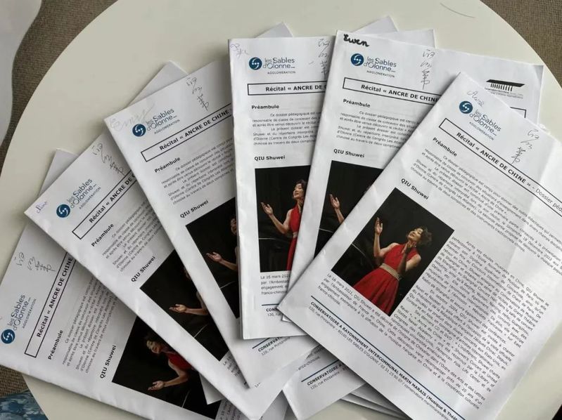 孩子们送上了亲手绘制的充满爱意与感谢的中法文海报,邱曙苇回馈给每个孩子亲笔签名的唱片,同时在每位小朋友为这次音乐会所学习的中国文化小册子上签名留念。