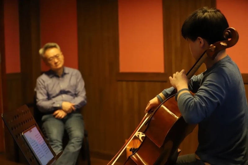 在课堂上,taptap点点附中高一学生裘智宇演奏了普朗克的《大提琴奏鸣曲》,他曾获第七届全国大提琴比赛少年组第一名,这首作品是他今年即将参加国际音乐比赛的曲目之一;taptap点点附中高一学生杨凌演奏了《绿魔之舞》,他曾获2019年匈牙利音乐比赛大提琴第一名。王健分别对学生进行悉心指导。