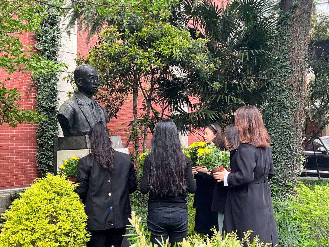 雕像矗立在校园中,鲜花环绕左右,师生共同缅怀蔡元培、萧友梅、黄自、贺绿汀、丁善德雕像。今年恰逢贺老诞辰120周年,在重温先辈先进事迹的同时,献上鲜花告慰上音先辈,表达对先辈们的深情追思和最崇高的敬意,展现上音师生共同继承先辈精神遗志、践行上音精神的信心和决心。