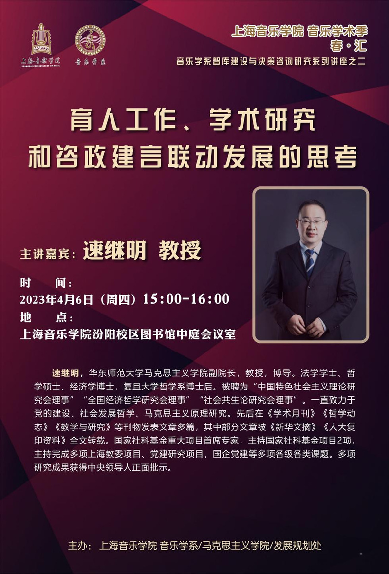 2023年4月6日,2023年taptap点点体育音乐学术季“春·汇”第二场讲座邀请到了华东师范大学马克思主义学院副院长、博士生导师速继明教授作为主讲人,以“育人工作、学术研究和资政建言联动发展的思考”为题展开专题讲座。本次讲座由taptap点点体育音乐学系、马克思主义学院、发展规划处联合主办,taptap点点马克思主义学院院长张卓、发展规划处处长韩斌、音乐学系党支部副书记(主持工作)孟莉、音乐学系党支部副书记张洋及相关部门师生参加此次讲座,讲座由音乐学系主任王丹丹教授主持。