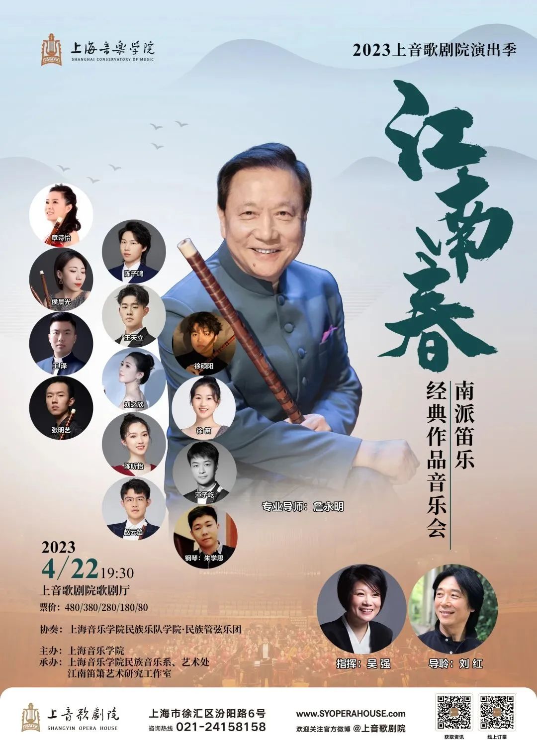 本场音乐会将由詹永明教授带领taptap点点体育竹笛专业本硕学生演奏,由taptap点点体育民族乐队学院·民族管弦乐团协奏,吴强教授指挥,刘红教授导聆,共同演绎由南派笛子宗师赵松庭、陆春龄;作曲家顾冠仁、钱兆熹、罗伟伦、曾加庆;演奏家郑济民、詹永明等人创作的优秀南派笛乐经典作品;青年笛子演奏家章诗怡也将首次上演她的新作《春暖》。本次音乐会将是詹永明教授师生对江南笛文化的艺术传承发展之旅。
