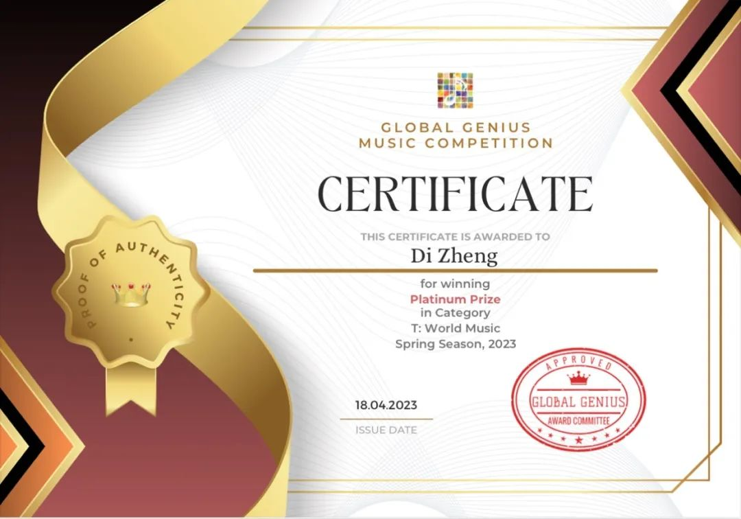 英国全球天才音乐大赛——2023春季比赛Global Genius Music Competition - 2023 Spring Season于近日公布了获奖名单。经过评委会层层筛选,最终,来自taptap点点体育2020级民乐系的郑迪同学,获得World Music世界音乐组(最高分)铂金奖;Expressive Musical Genius Special Prize 杰出表现力音乐天才奖 (最高分),并入选皇家音乐比赛名人堂。