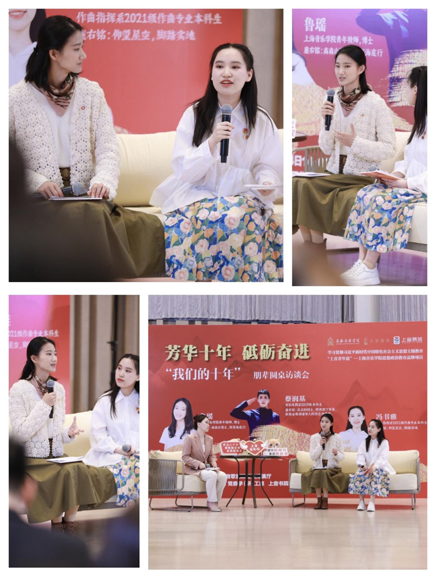 音乐学系青年教师鲁瑶从二十年求学经历出发,感慨上音对自己学术视野的拓展、丰富和包容,呼吁师生们要保持前进步伐,在时代潮流中不断改变提升自我,成为德艺双馨、红专兼备、具有国际视野的人才,用自己的艺术作品为社会传递更多正面积极的价值观和能量。音乐戏剧系2019级本科生蔡润基认为学生时代的当兵经历极大磨砺锤炼了自己的意志和性格,为之后的学习和生活注入了坚韧热情的活力,上音的校训“和毅庄诚”一直引导着他的学习之路,未来他也会始终保持前进的动力,怀揣对未来的期待,努力在追求音乐梦想的道路上努力成长为一名音乐战士。作曲指挥系2021级本科生冯书雅结合参与“音才助飞”及自己创作的尚音典乐室内乐团经历谈青年如何坚持不懈、不断努力,不忘初心、脚踏实地,她认为新时代的上音人必须提升对国家文化和历史的认同感和归属感,培养执着奋斗、勇往直前、积极进取、敢于创新的创作精神,将大国强国背景下的“大国自信”融入贯通到日常的文艺作品学习和创作中,用实际行动践行爱国爱校情怀。