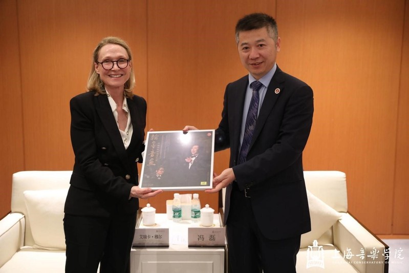 (冯磊向艾瑞卡·穆尔院长赠送《廖昌永中国艺术歌曲维也纳独唱音乐会》唱片)
