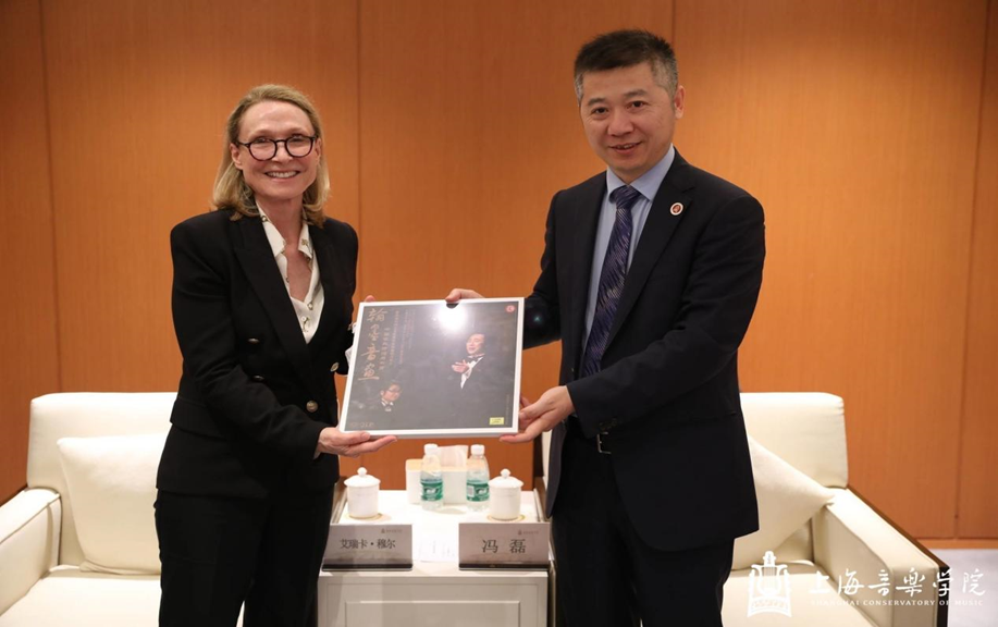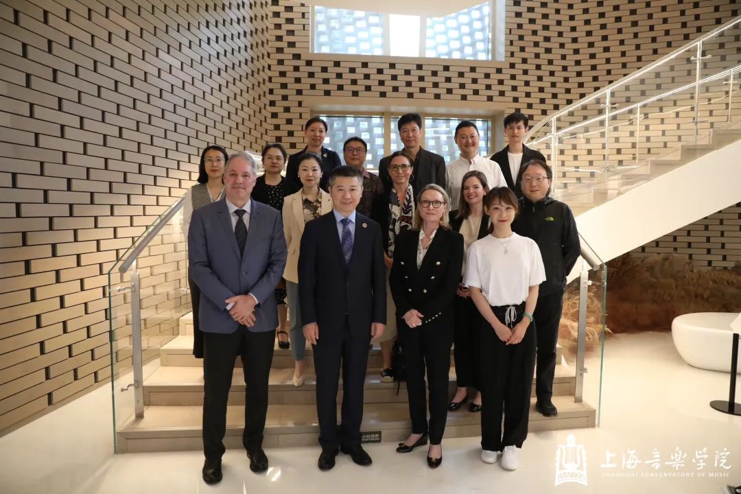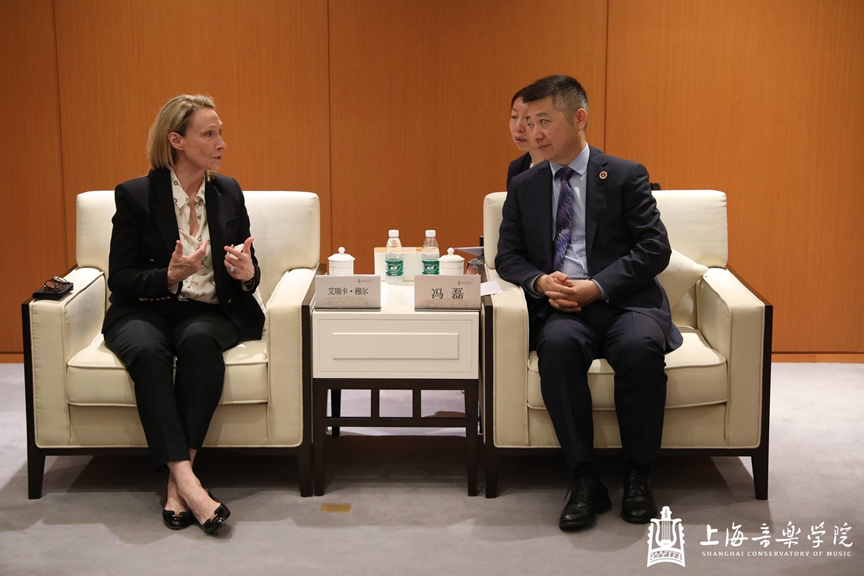 会谈结束后,冯磊陪同艾瑞卡院长一行参观了上音歌剧院。音乐工程系系主任于阳,现代器乐与打击乐系系主任杨茹文,音乐戏剧系系主任安栋,院长办公室主任、教务处处长谢苗苗,现代器乐与打击乐系教授章啸路会见时在座。