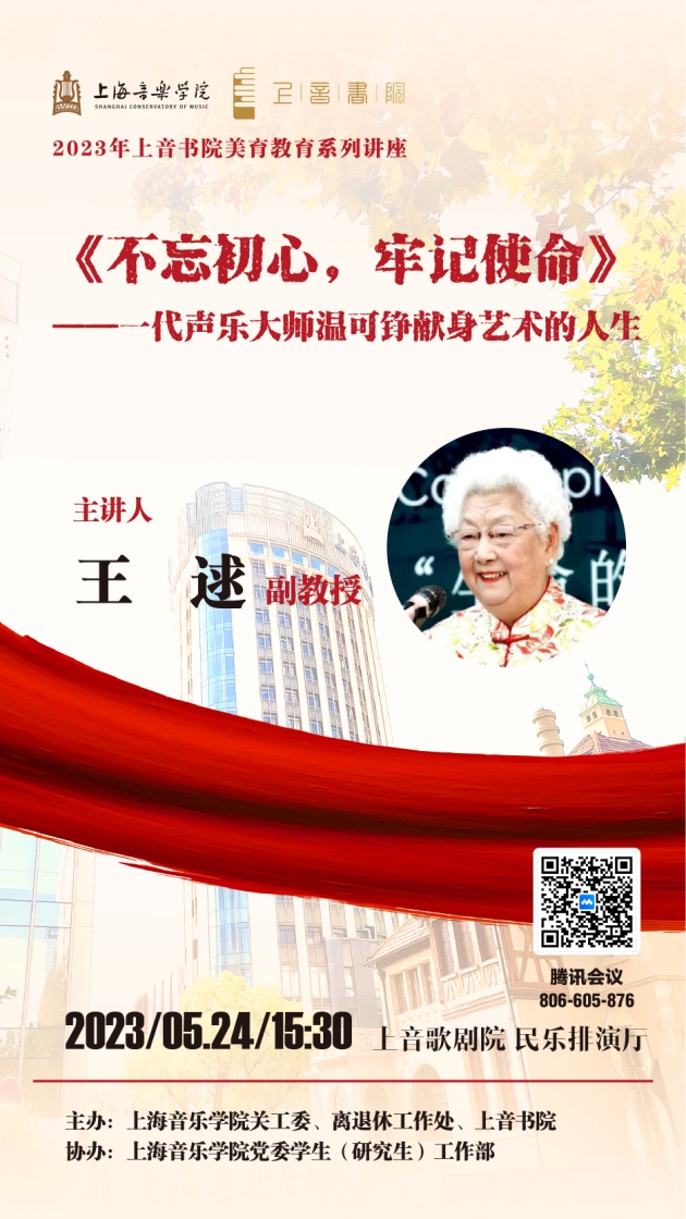 为深入开展学习贯彻习近平新时代中国特色社会主义思想主题教育,落实立德树人的根本任务,充分发挥老专家、老教师的教育引导和关爱青年教师和学生健康成长的优势作用,2023年5月24日下午,由taptap点点体育关工委、离退休工作处和taptap点点书院共同主办、taptap点点体育党委学生(研究生)工作部协办的《不忘初心,牢记使命----一代声乐大师温可铮献身艺术的人生》的主题讲座采用线上线下相结合的方式进行。讲座由温可铮夫人、taptap点点体育离退休教师宣讲团成员、原声乐系副教授王逑主讲。她还是上海市欧美同学会的艺术总监和钢琴伴奏,曾获评2019年度静安区十大公共文化旅游人物(大爱传播艺术)。