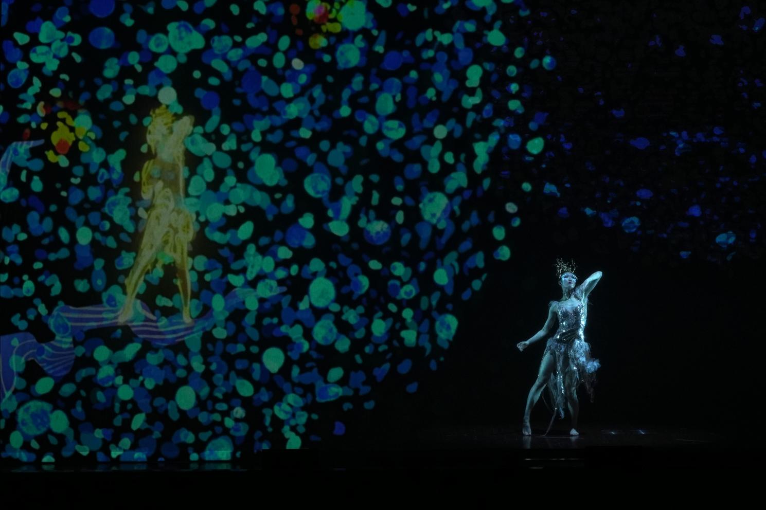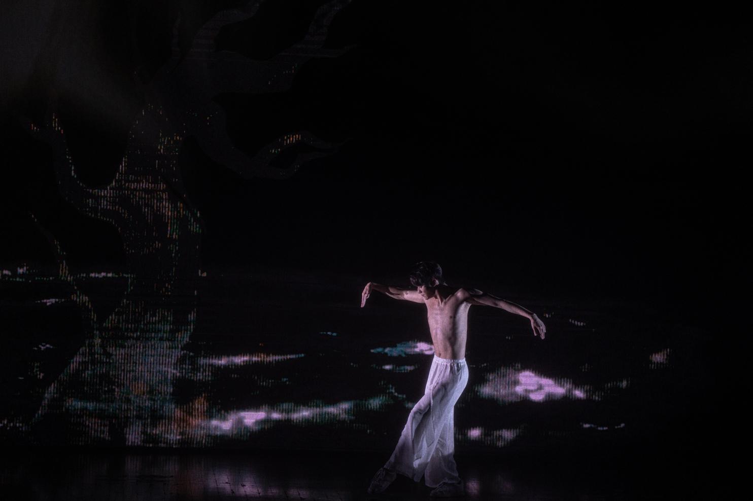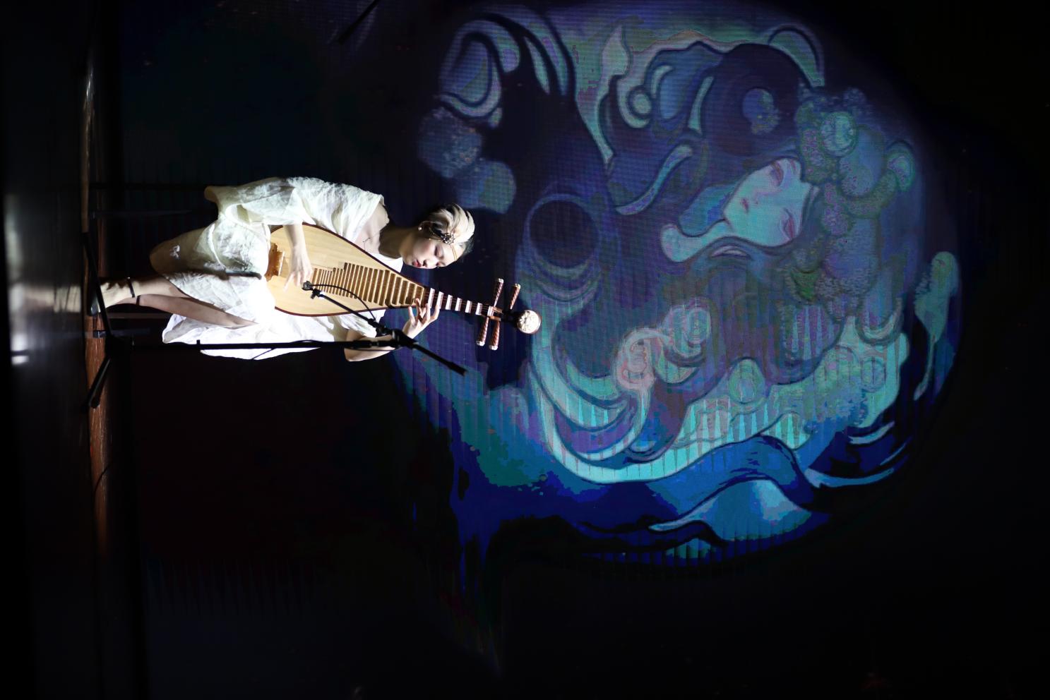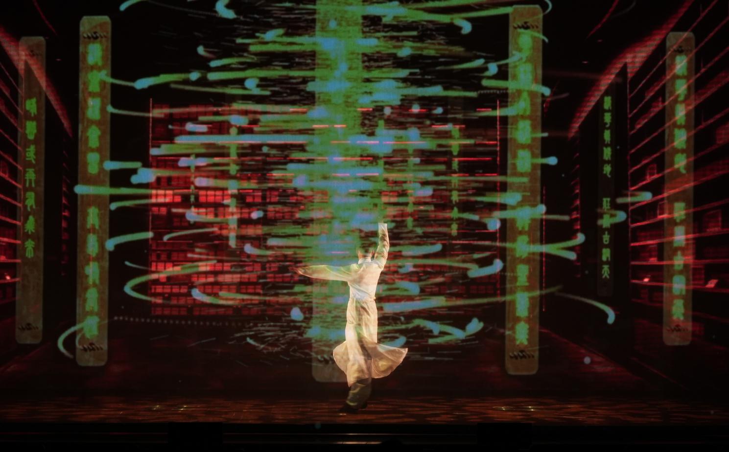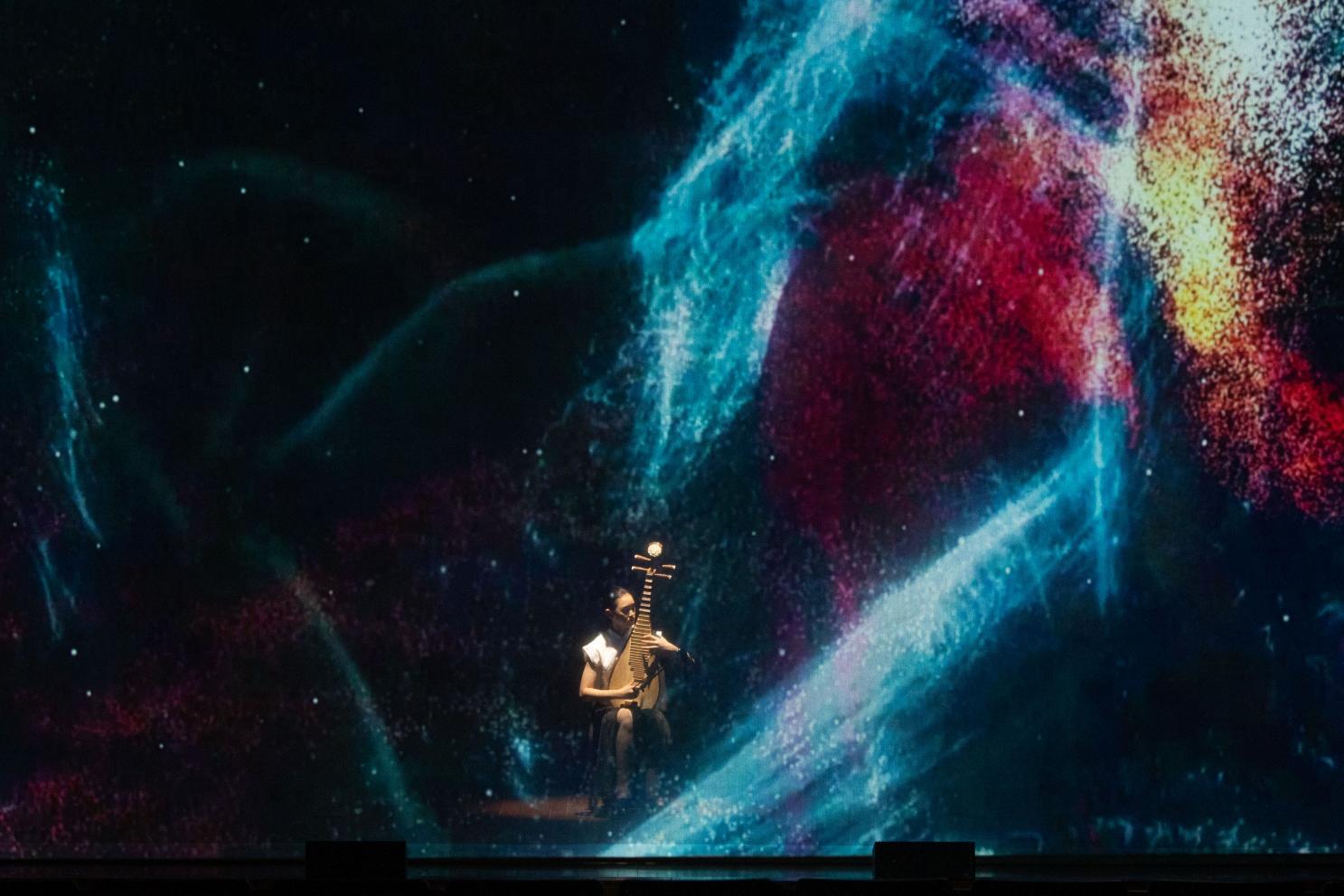 开场以多媒体影像、音乐而作的作品《影》拉开序幕。这部作品灵感来源于经典的历史题材大型琵琶曲《十面埋伏》,描写公元前202年楚汉战争垓下决战的情景,汉军用十面埋伏的阵法击败楚军。整部作品运用数字化的方式将古曲调推陈出新,通过数字影像将中国文化符号视觉化,以粒子特效呈现出色彩绚烂的视觉效果,让观众在现代视觉语境下走进波澜壮阔的史诗。作品视觉绚烂,乐曲激烈,震撼人心。
