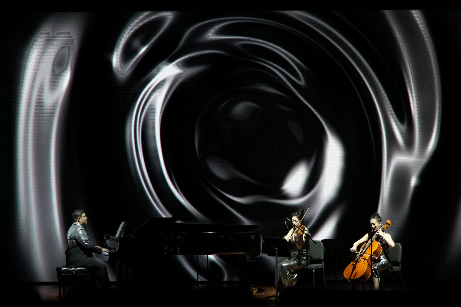 清风徐徐吹来,大海潮起潮落,一轮明月从茫茫的海面缓缓升起,大提琴、小提琴与钢琴演奏的忧伤旋律静静铺开,柔和舒畅......作品《熵》选用约翰 ·威廉姆斯的作品:电影《辛德勒的名单》主题曲“Theme From Schindler's List ”,在契合多媒体舞台的同时又给人无限的想象力,带领观众感受关于“熵”的思考,AI人工智能出现之后,世界和宇宙的关系出现新的发展方向.......
