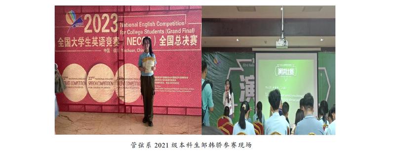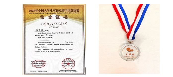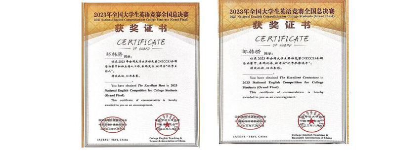 “在本次大学生英语竞赛全国总决赛中,邹韩骄和徐景绚同学不负众望,创造佳绩。两位同学厚积薄发,积极进取,终有所成。在此,衷心祝贺她们取得的好成绩,并感谢学校为参赛选手们提供的支持和帮助!”