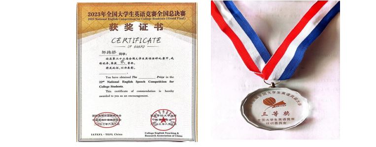 “英语是一门复杂、实用的国际通用语言,需要坚定不移的毅力和持之以恒的练习才能学好。对我而言,学习英语的过程虽然艰辛但是受益无穷。通过不断的听说读写的练习,我力求充分发挥个人语言潜能。我的成功很大程度上归功于我对英语学习的热情,归功于我坚持不懈的努力,归功于老师、家人和朋友的信任、指导和支持。这一奖项并不仅仅代表着个人成果,它更是证明了教育的力量,证明了语言在联系日益紧密的世界中弥合差距和促进理解的重要性。