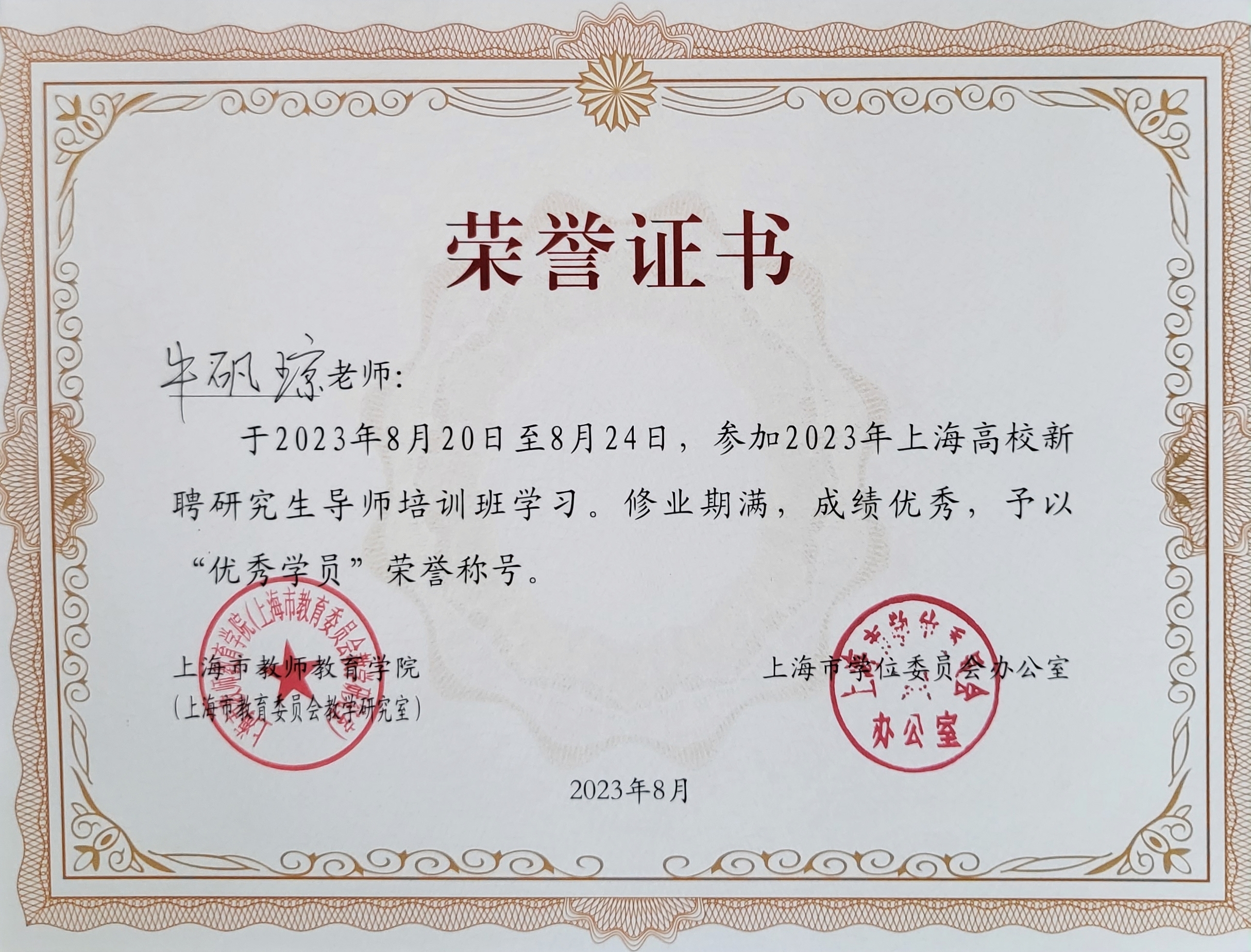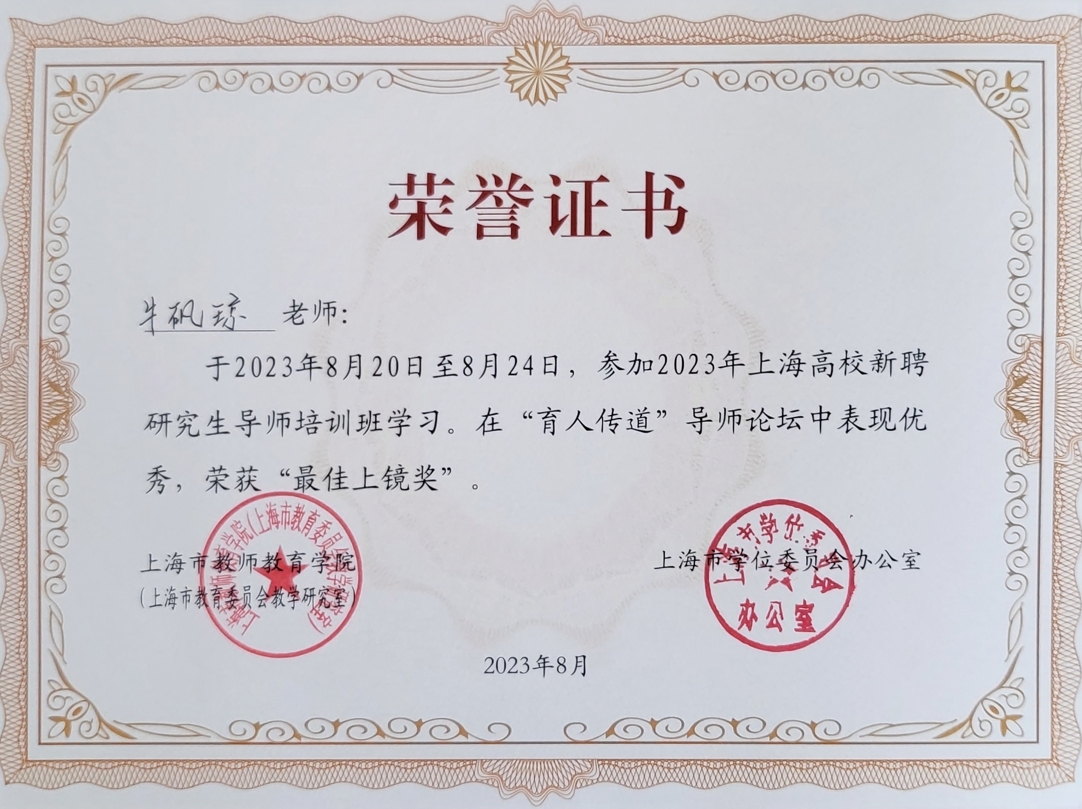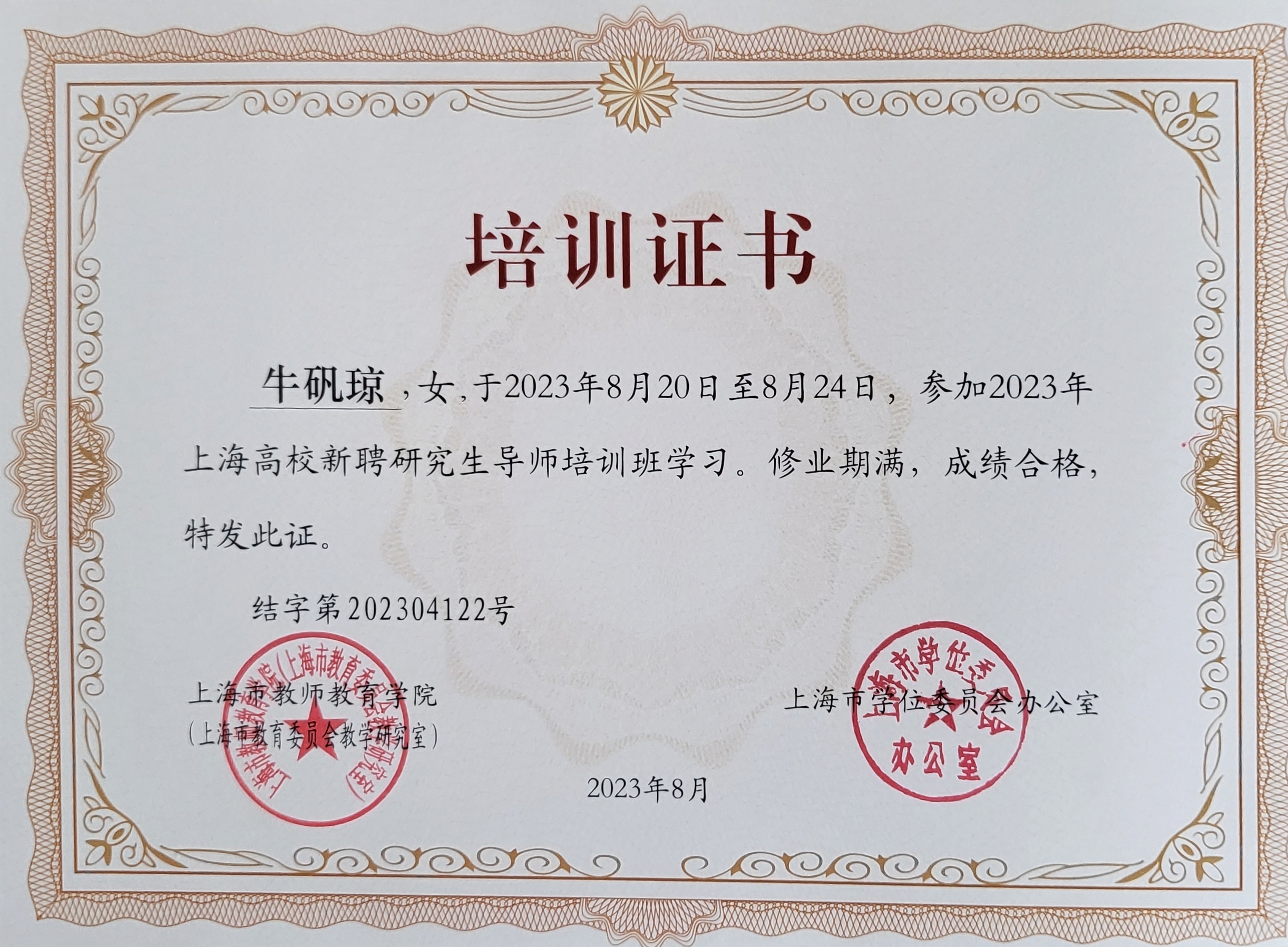 为提升新聘研究生导师立德树人能力,2023年8月20日至24日,由上海市学位委员会、上海市教育委员会主办,上海市师资培训中心承办的上海市高校新聘研究生导师培训班举行。牛矾琼,参加2023年上海高校新聘研究生导师培训班学习,修业期满,成绩优秀,荣获“优秀学员”荣誉称号,并在“育人传道”导师论坛中,荣获“最佳上镜奖”。
