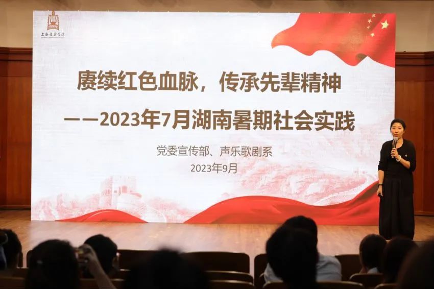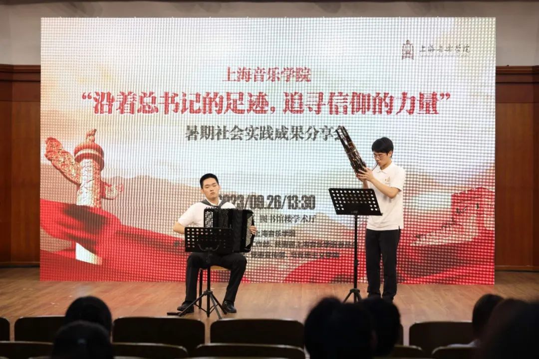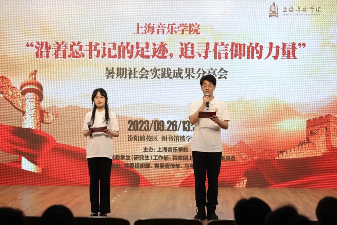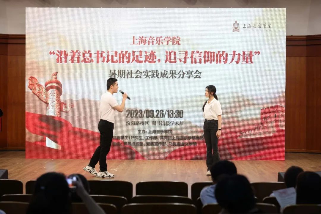 为了引导我院广大学生深入学习宣传贯彻党的二十大精神,推动习近平新时代中国特色社会主义思想进教材、进课堂、进头脑。丰富完善“大思政课”教育教学形式,不断推动构建更加有效的“音乐+思政”工作体系。9月26日13:30,由上海音乐学院主办,党委学生(研究生)工作部、团委承办,党委组织部、党委宣传部、马克思主义学院共同协办的“沿着总书记的足迹,追寻信仰的力量”暑期社会实践成果分享会在汾阳路校区图书馆楼学术厅举行。暑期社会实践成果分享展览于图书馆楼长廊展出。党委书记裴小倩,党委副书记、副院长徐卫,各团队师生代表出席本次活动。活动由音乐工程系唐松涛、民族音乐系陈徵羽主持。