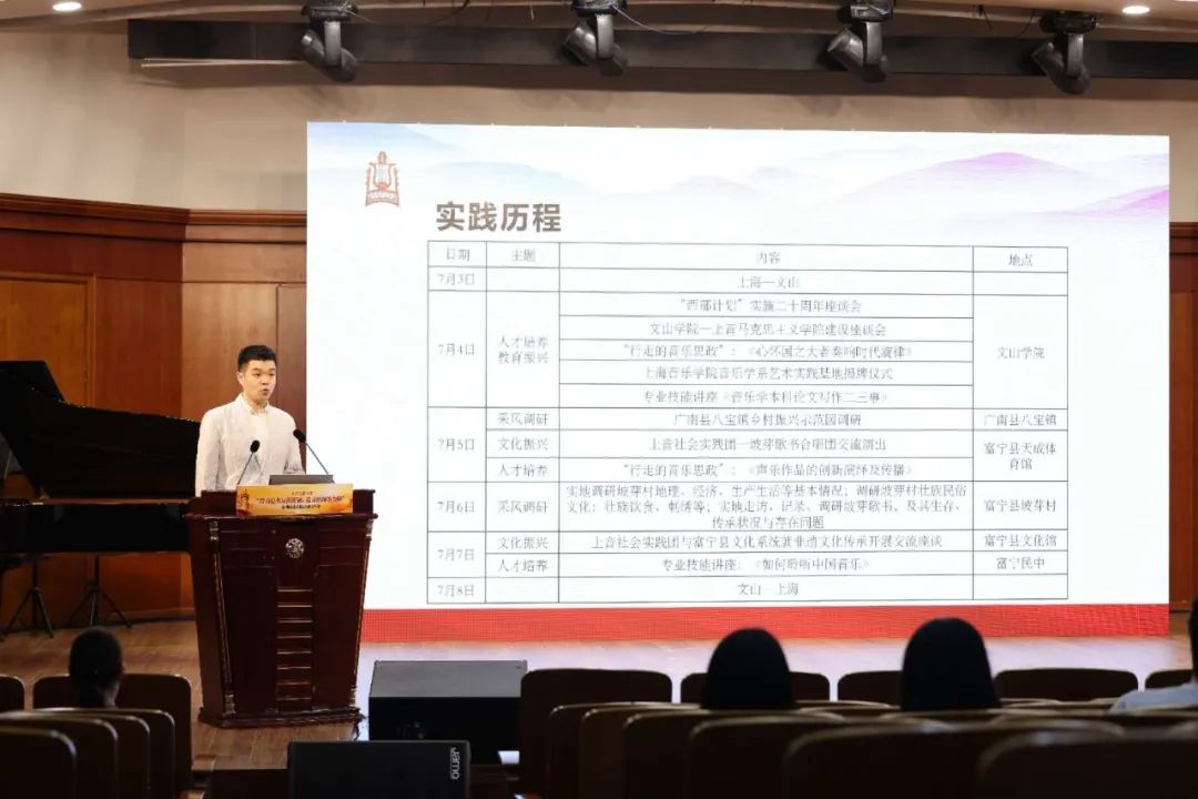 随后,5支团队的社会实践成果汇报,分别是由管弦系团总支书记、辅导员付祉云和管弦系学生党支部书记、辅导员刘莹汇报的河北正定暑期社会实践成果,数字媒体艺术学院副教授、视觉艺术基础教研室主任毕盈盈汇报的四川大凉山暑期社会实践成果,党委宣传部副部长肖阳汇报的湖南暑期社会实践成果,音乐学系红色音乐文化博士生刘鑫炎汇报的云南暑期社会实践成果,还有民族音乐系党支部副书记周菲汇报的台州暑期社会实践成果。5支团队的成果汇报精彩纷呈,别开生面,让我们深刻的感受到了用自己的专业知识植根于祖国偏远地区所带来的成就感和使命感,体会了偏远地区淳朴热烈的风土人情,以及不同文化所带来的碰撞与融合,学术厅内反响热烈,掌声雷动。