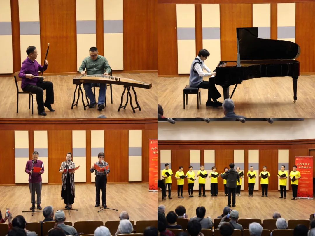 为丰富广大老同志的文化娱乐生活,展现老同志们的风采,老少上音人登台演出。老同志们带来舞蹈《我的祖国》、合唱《上音院歌》、诗朗诵《美丽中国》和京剧《梨花颂》《吊金龟》;学生们带来演唱、笙独奏、钢琴独奏等,节目精彩纷呈,得到老前辈们的热赞与喜爱,展现出上音老前辈与新生代之间的浓浓情谊。
