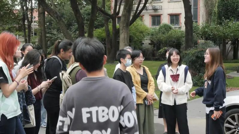 紧接着,同学们来到了沿淮海路建筑群。不同风格的历史建筑与街区相接,成为了淮海路一道靓丽的风景线。无论是德国文艺复兴风的“音乐城堡”、白色现代风的“花园洋房”,还是英式花园风的“小红楼”,法国文艺复兴风的“法式大宅”,每一栋建筑都典雅大气,富有历史底蕴。